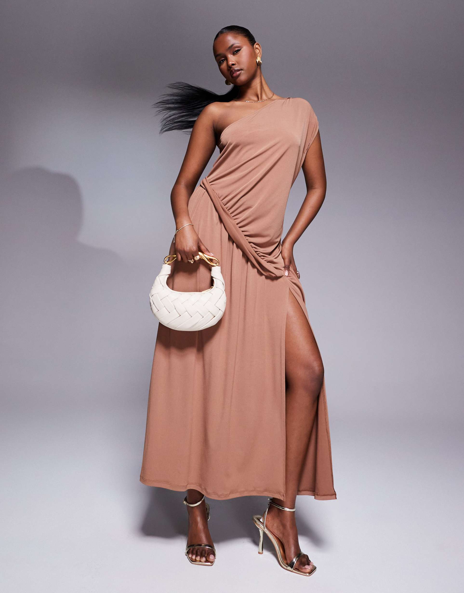 ASOS DESIGN ONE SHOULDER MAXI DRESS WITH RUCHING DETAIL AND SIDE SLIT IN MAUVE