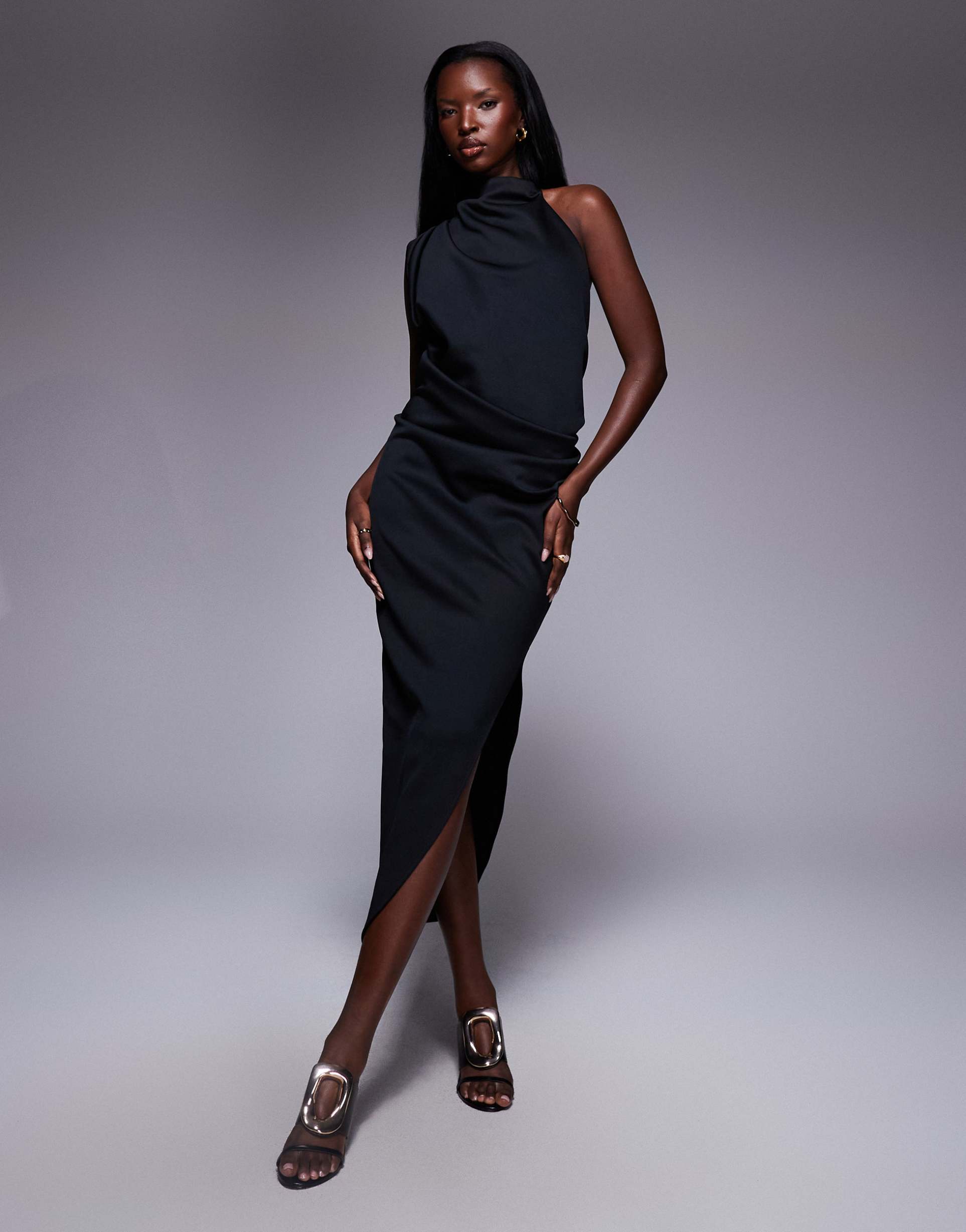 Smooth matte black scuba fabric sculpts a regular fit sheath silhouette with a chic one-shoulder strap and sleeveless design. The midi length features a stylish front slit and delicate ruching that enhances movement and adds subtle texture. An open back introduces a bold, elegant touch perfect for cocktail parties, date nights, or stylish evening outings. This modern, stretchy dress balances comfort with sophistication, making it a versatile choice for all-weather wear and refined occasions.