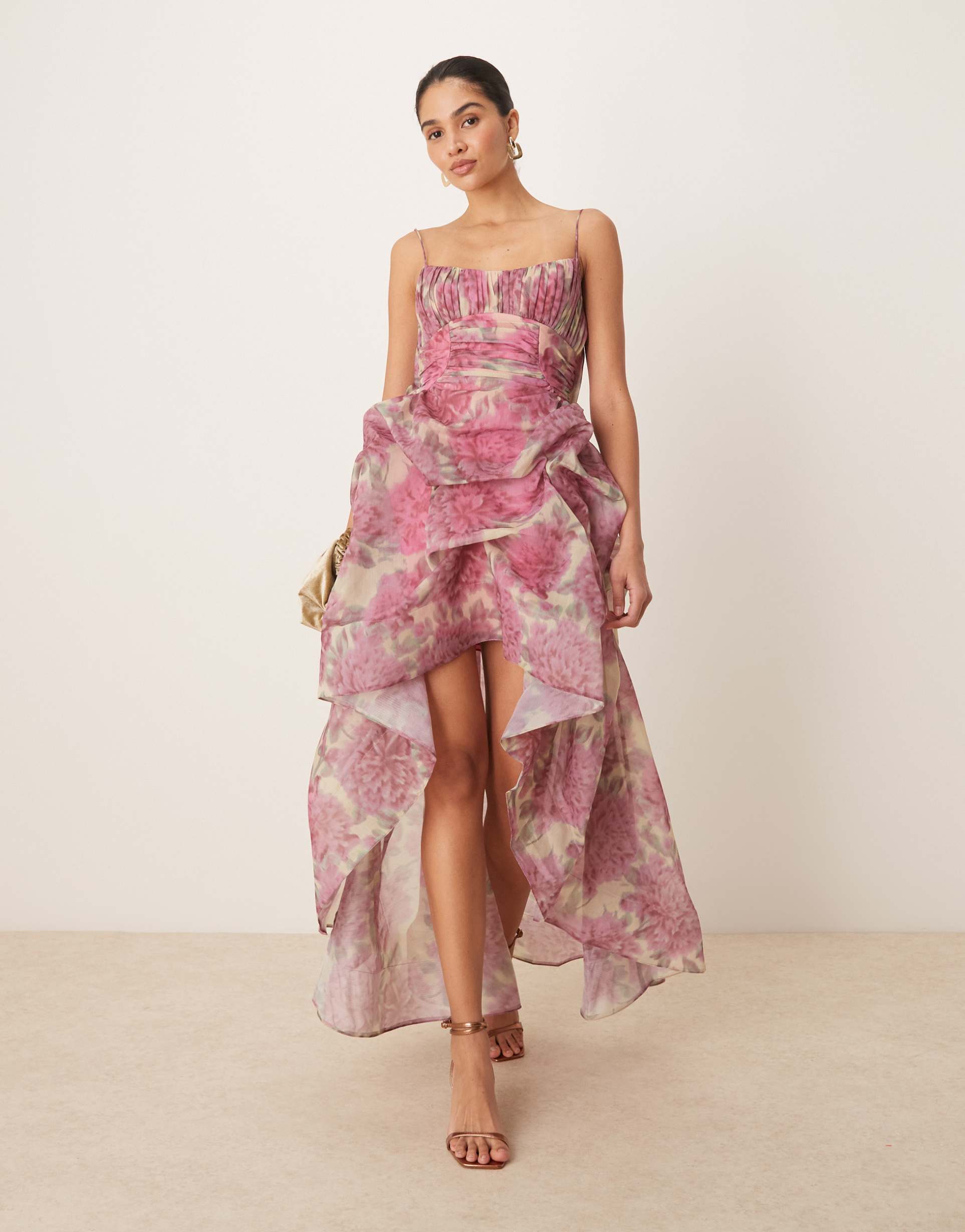 ASOS DESIGN ORGANDIE MAXI DRESS WITH MANIPULATED SKIRT AND HIGH-LOW HEM IN PINK FLORAL PRINT