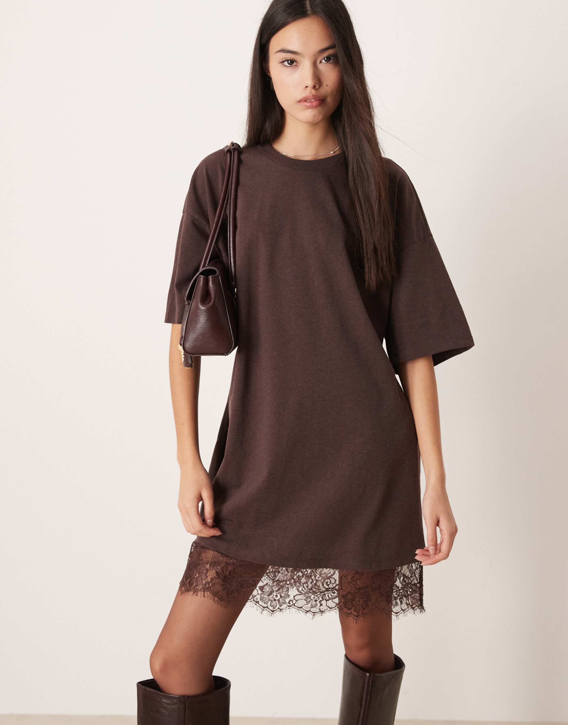 ASOS DESIGN OVERSIZED MINI DRESS WITH LACE HEM TRIM IN CHOCOLATE BROWN