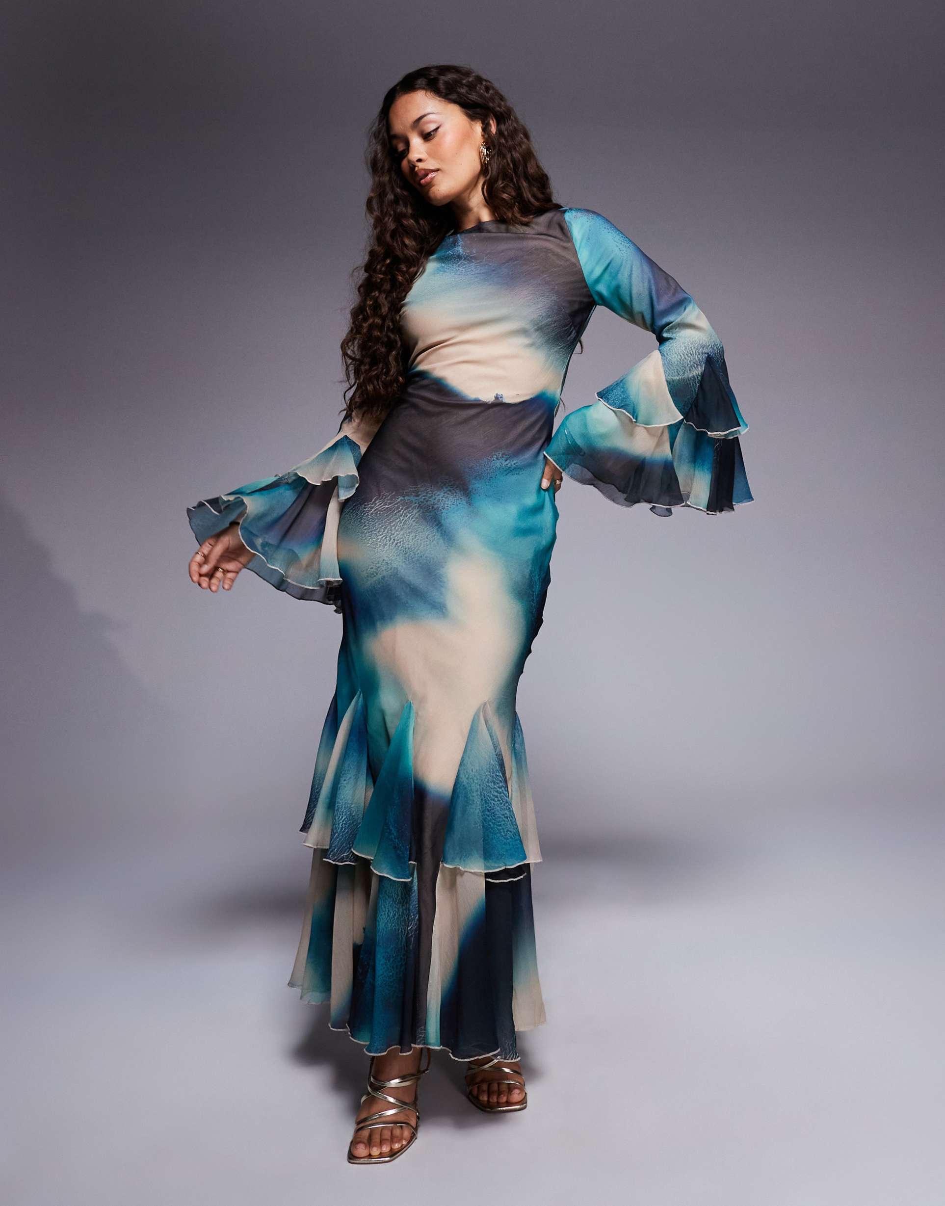 ASOS DESIGN PETITE ASYMMETRIC RUFFLE HEM BIAS MAXI DRESS IN MARBLE PRINT