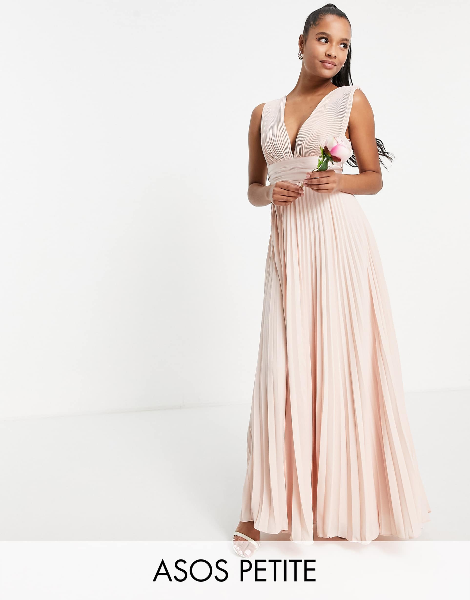 Soft blush satin and flowing pleats define this maxi slip dress, featuring a plunge neckline and sleeveless cut for a graceful silhouette. The satin wrap waist with tie-up detail enhances the figure with a refined touch, complemented by a zip-back closure. Perfectly tailored for petite frames, this elegant piece suits formal occasions such as weddings, bridesmaid duties, and special events in spring or summer. Its classic design and sophisticated pleating create a timeless look that transitions beautifully from ceremony to celebration.