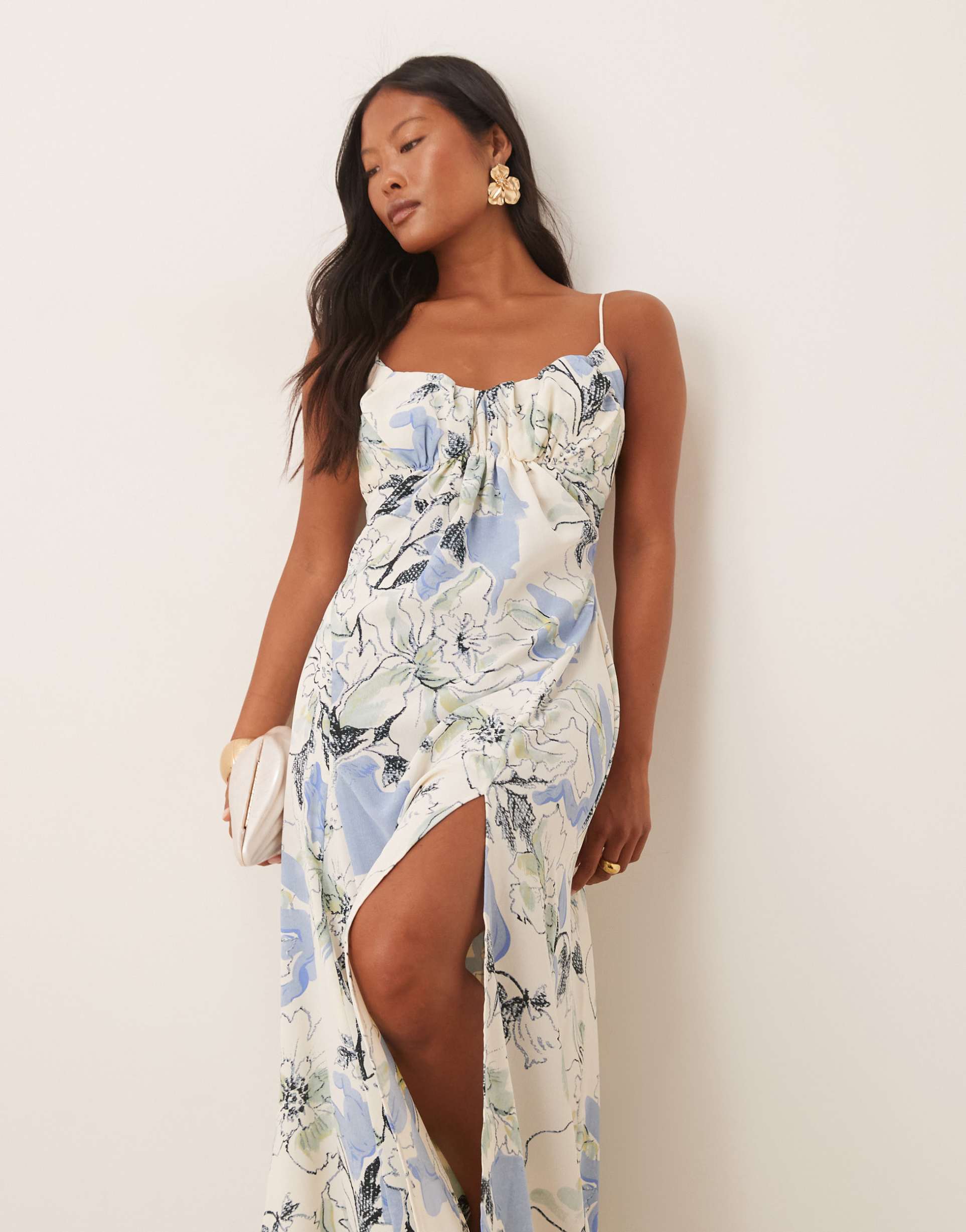 ASOS DESIGN PETITE GATHERED BUST STRAPPY CROSS BACK MIDI DRESS IN BLUE FLORAL PRINT