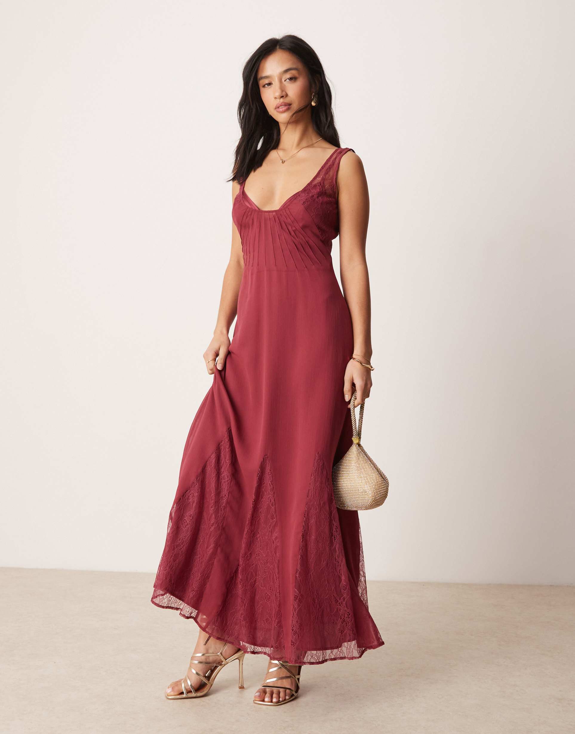Effortless romance for soirees and sunlit days, this raspberry lace-and-chiffon Maxi drapes with a soft, fluid sway. The sleeveless, scoop-neck silhouette is elevated by delicate lace inserts at the bodice and a sheer chiffon overlay that reveals just enough shimmer. A petite-friendly fit, the dress falls in a flowing A-line with a graceful godet-like flare, finished with a scalloped hem that echoes the lace trim. Wear it with strappy sandals and a clutch for garden parties, or dress it up with heels for evening events. A timeless piece that moves from day to night with ease.