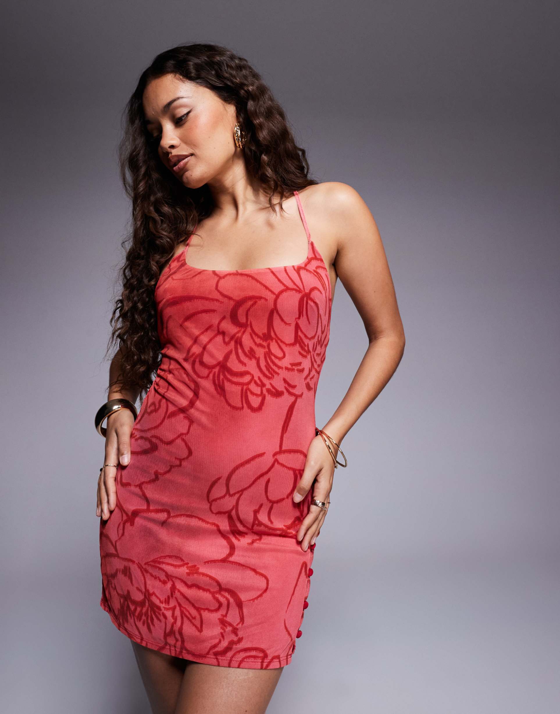 Soft, sheer mesh fabric and a figure-flattering camisole silhouette define this pink floral mini dress. The square neckline and criss-cross spaghetti straps add a delicate, trendy touch, while the contrast button placket on the side enhances its casual chic vibe. Perfectly tailored for petite frames with a regular fit, this mini dress is ideal for summer brunches, casual outings, and date nights. Its clean hemline and vibrant floral print make it a versatile and stylish choice for warm-weather occasions.