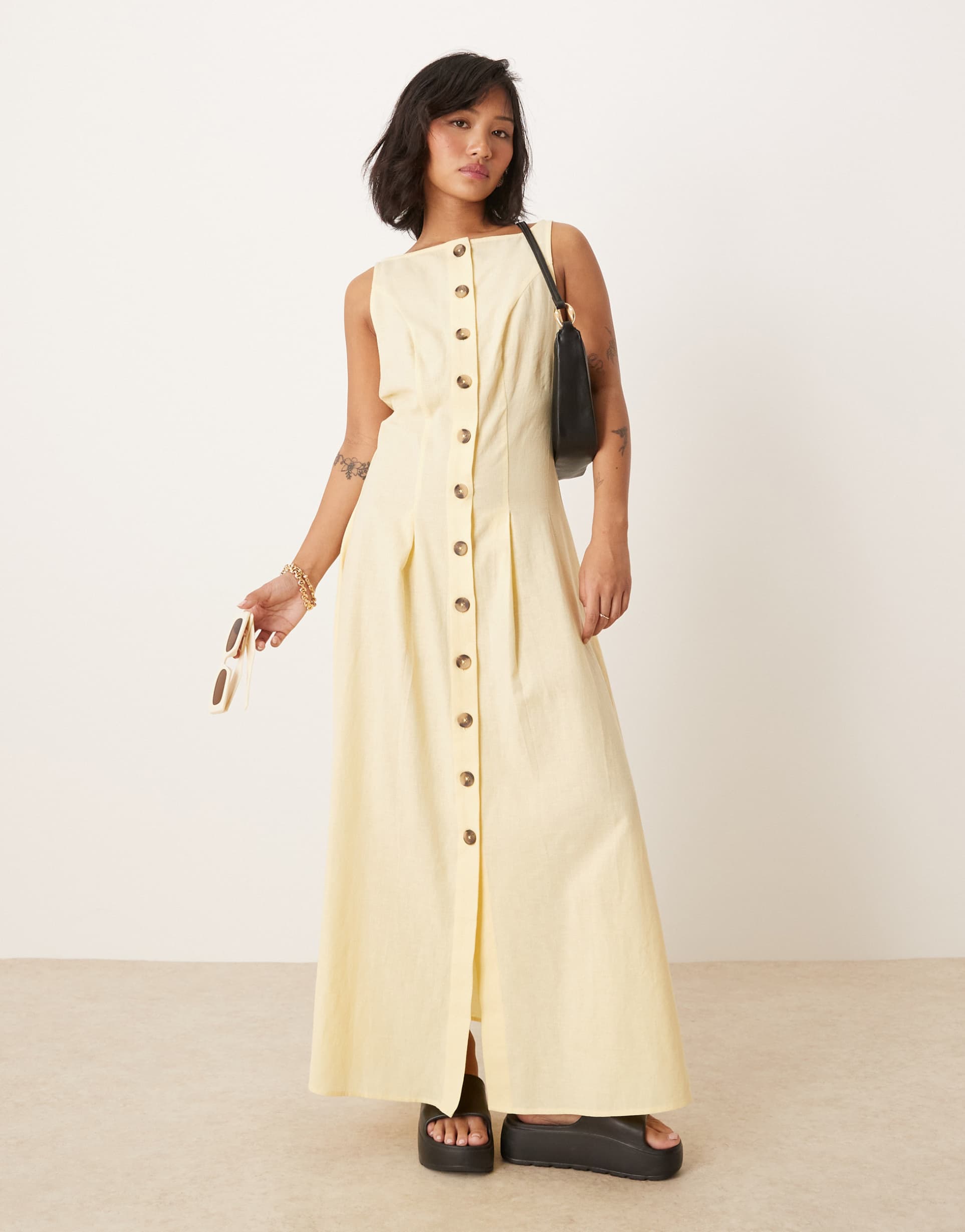 Softly woven cotton and linen blend fabric shapes this maxi dress into a relaxed shift silhouette perfect for warmer seasons. The sleeveless cut and elegant boat neckline enhance its minimalist appeal, while the full-length button placket down the front adds subtle design interest with matte brown buttons. Designed for petite frames, this regular fit maxi dress offers effortless style for casual outings, sunlit brunches, or vacation days. The clean hemline completes the look with a refined touch, making it a versatile staple for your spring and summer wardrobe.