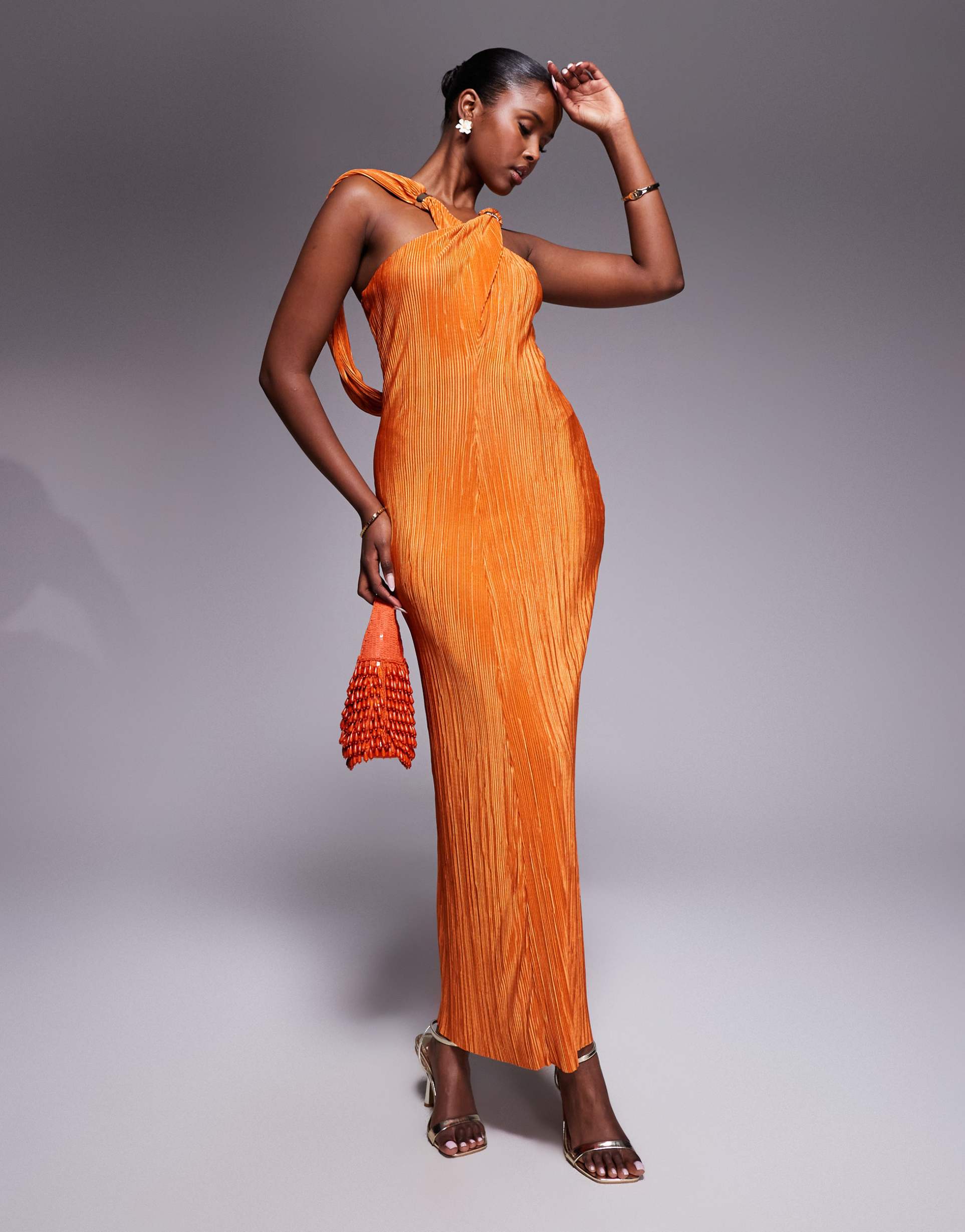 ASOS DESIGN PLISSE CROSS FRONT MAXI DRESS WITH DRAPED BACK IN ORANGE