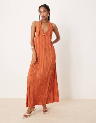 ASOS DESIGN PLISSE HALTER MAXI DRESS IN RUST