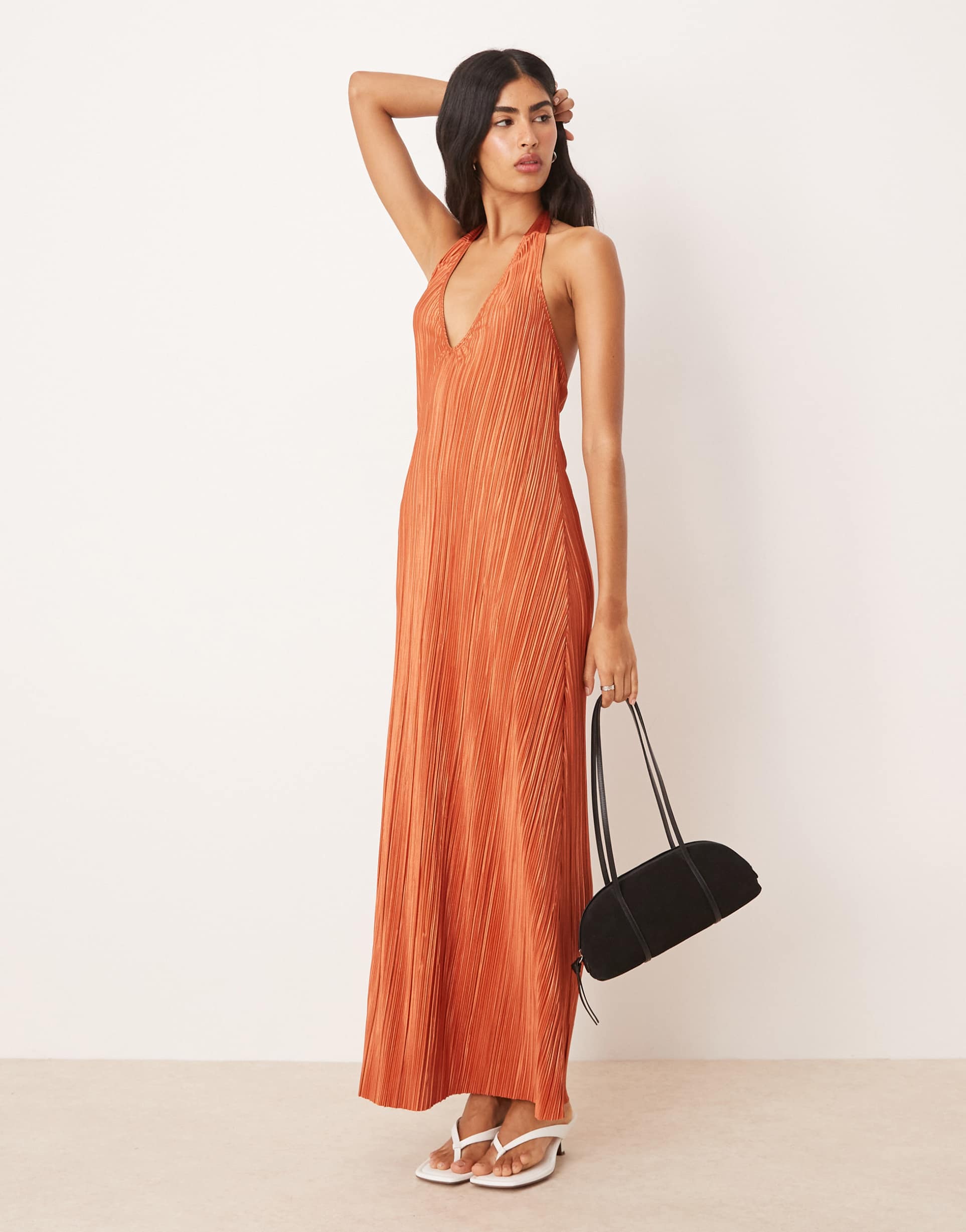 ASOS DESIGN PLISSE HALTER MAXI DRESS IN RUST