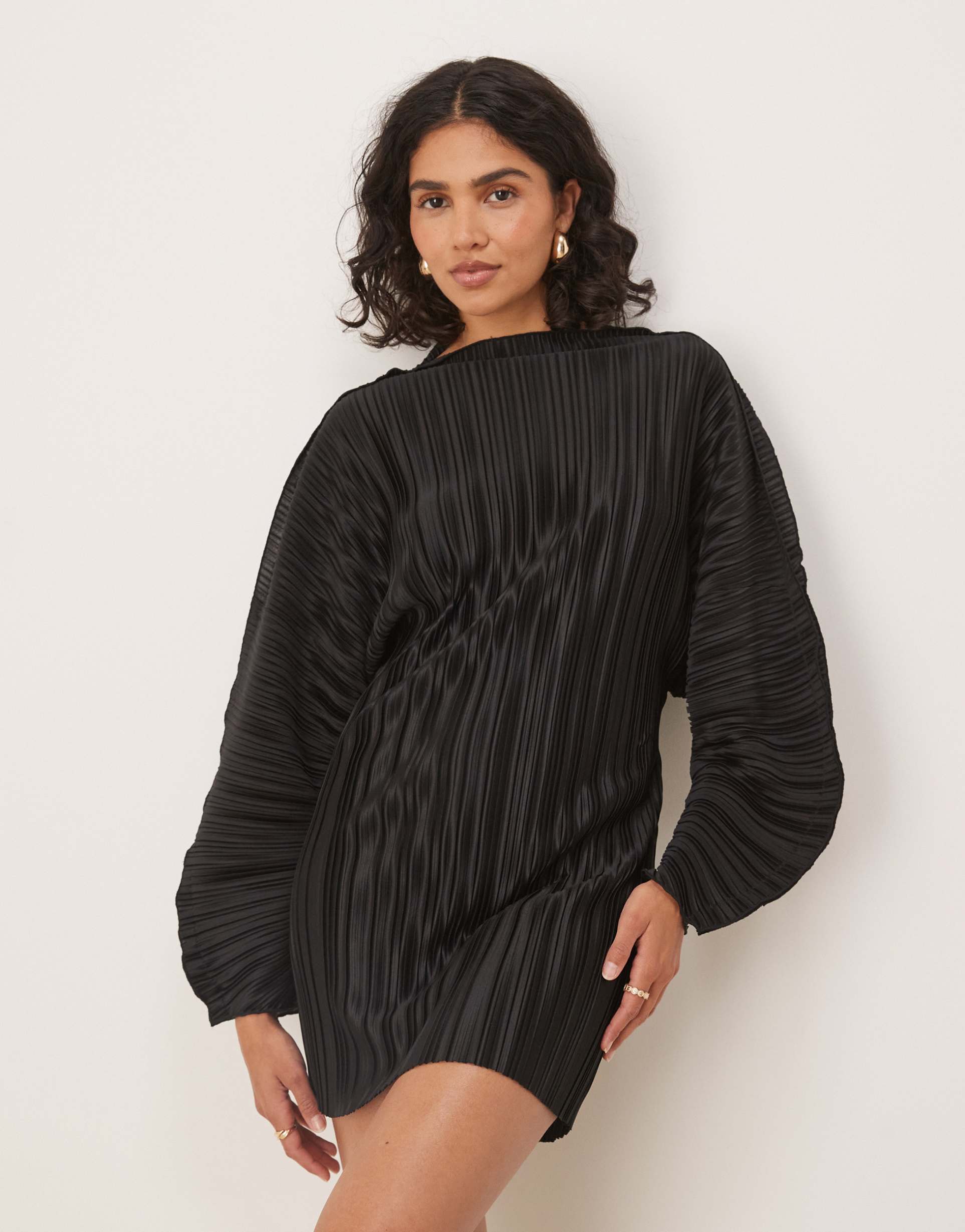 ASOS DESIGN PLISSE LONG COCOON SLEEVES MINI DRESS WITH WAIST SEAM IN BLACK