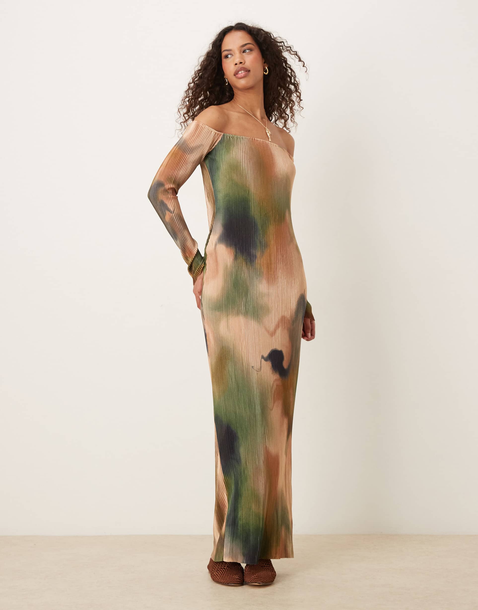ASOS DESIGN PLISSE OFF THE SHOULDER LONG SLEEVE MAXI DRESS IN PRINT