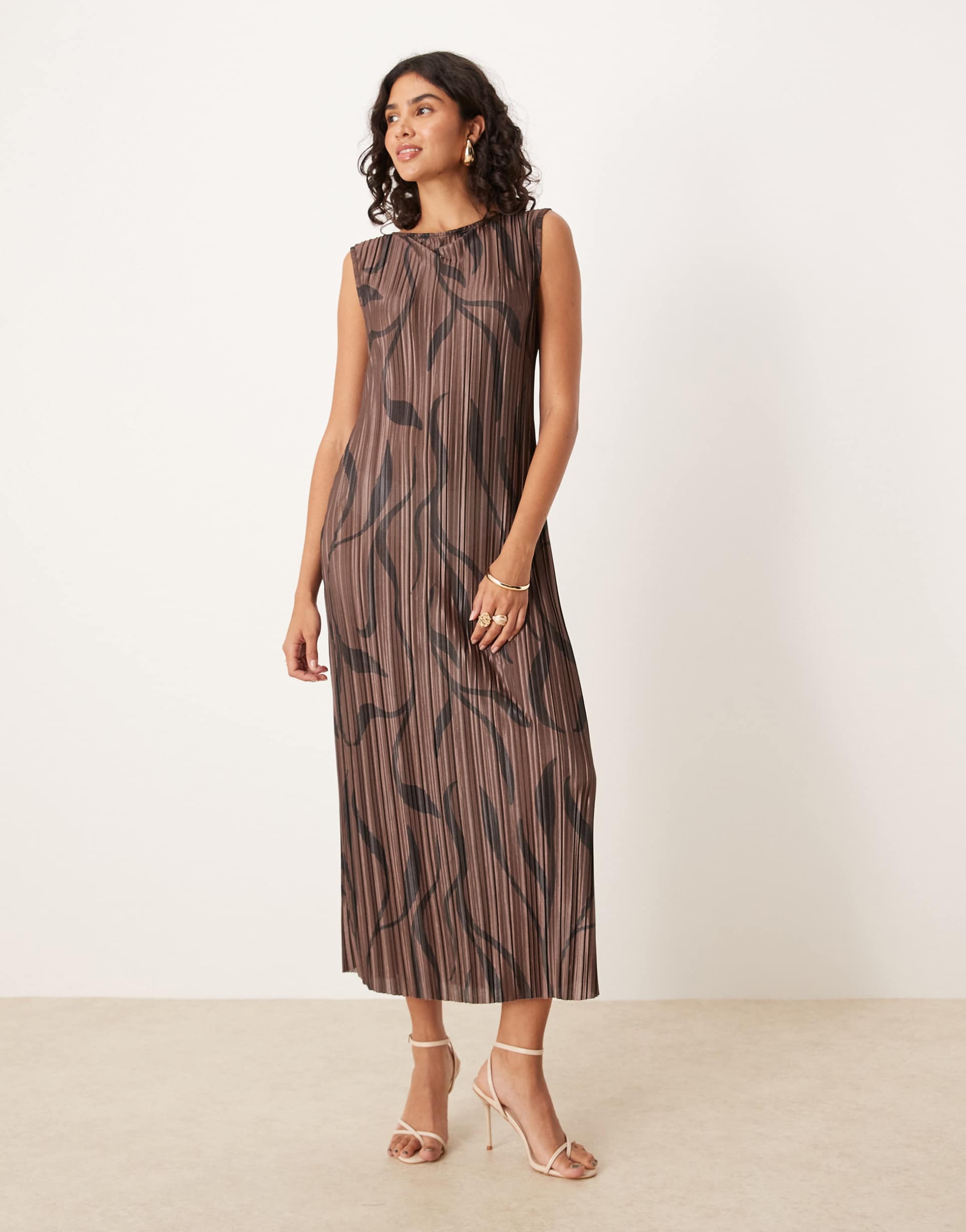 ASOS DESIGN PLISSE SLEEVELESS COLUMN MIDI DRESS IN BROWN SWIRL PRINT