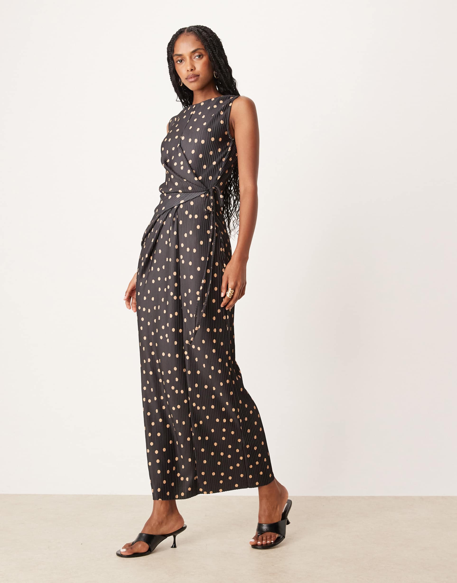 ASOS DESIGN PLISSE SLEEVELESS WRAP TIE FRONT MAXI DRESS IN POLKA DOTS