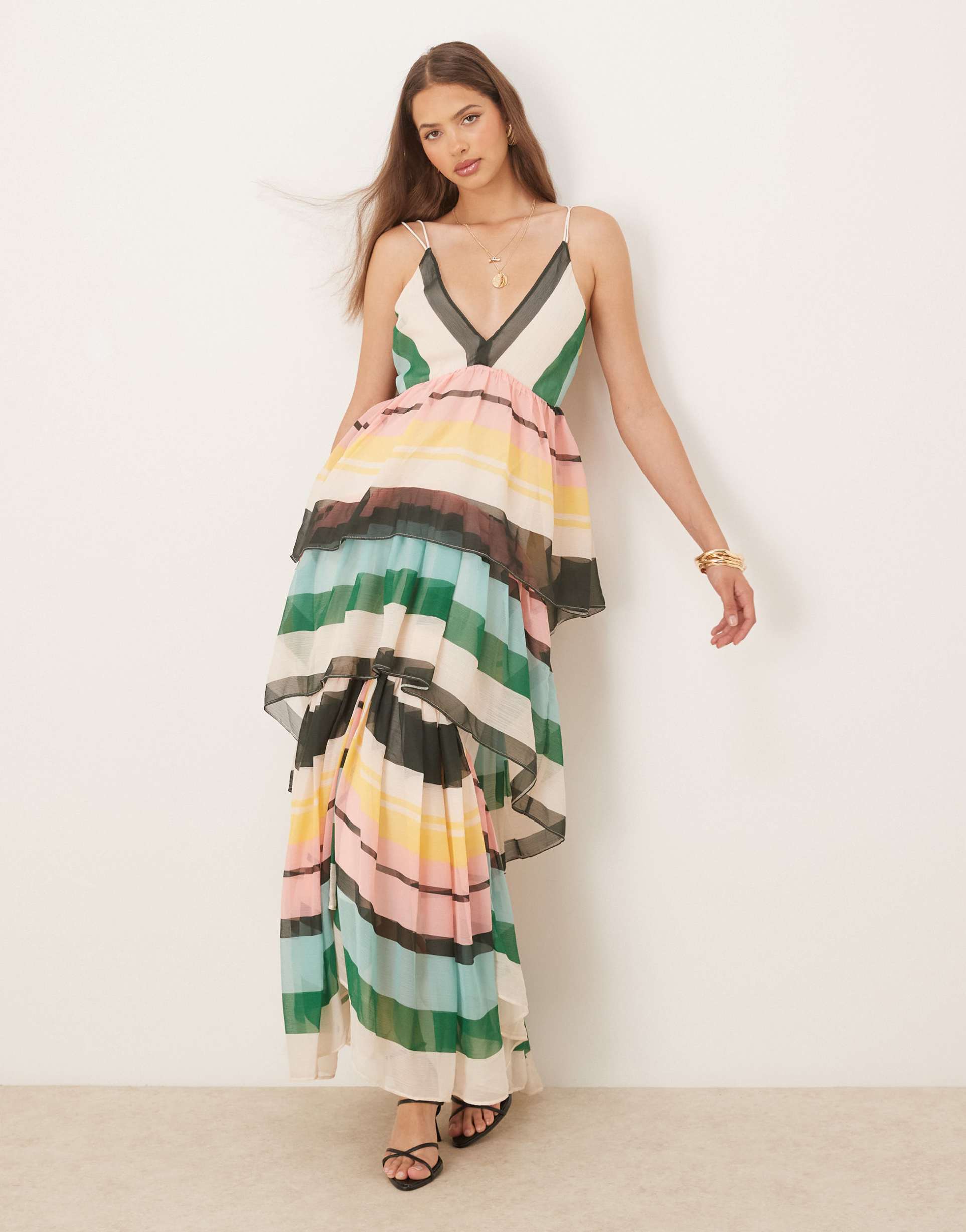 Soft chiffon fabric and a plunging neckline come together in this tiered maxi dress featuring a vibrant striped pattern and an open back that adds a modern twist. The regular fit and fixed straps offer comfortable support, while the asymmetric hemline enhances its elegant silhouette. Perfect for spring and summer occasions like cocktail parties, date nights, and wedding guest attire, this dress blends sophistication with playful color blocking for a standout look.