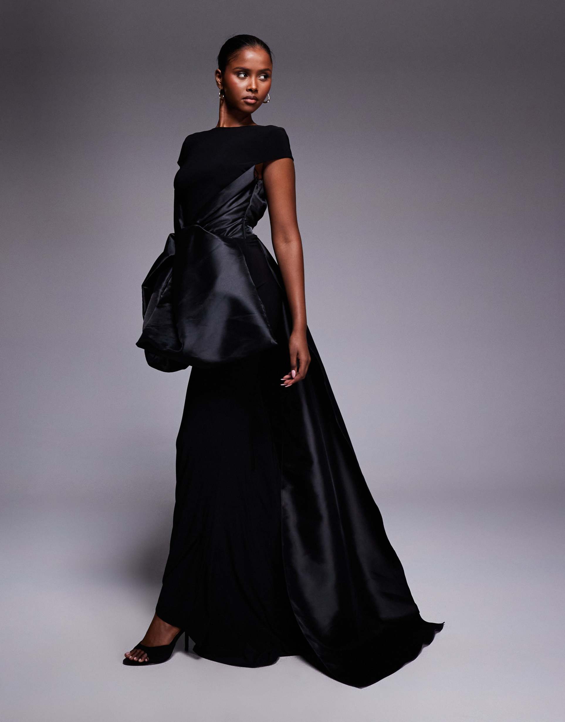 ASOS DESIGN PREMIUM MAXI DRESS WITH SATIN CONTRAST BOW FRONT AND TRAIN IN BLACK