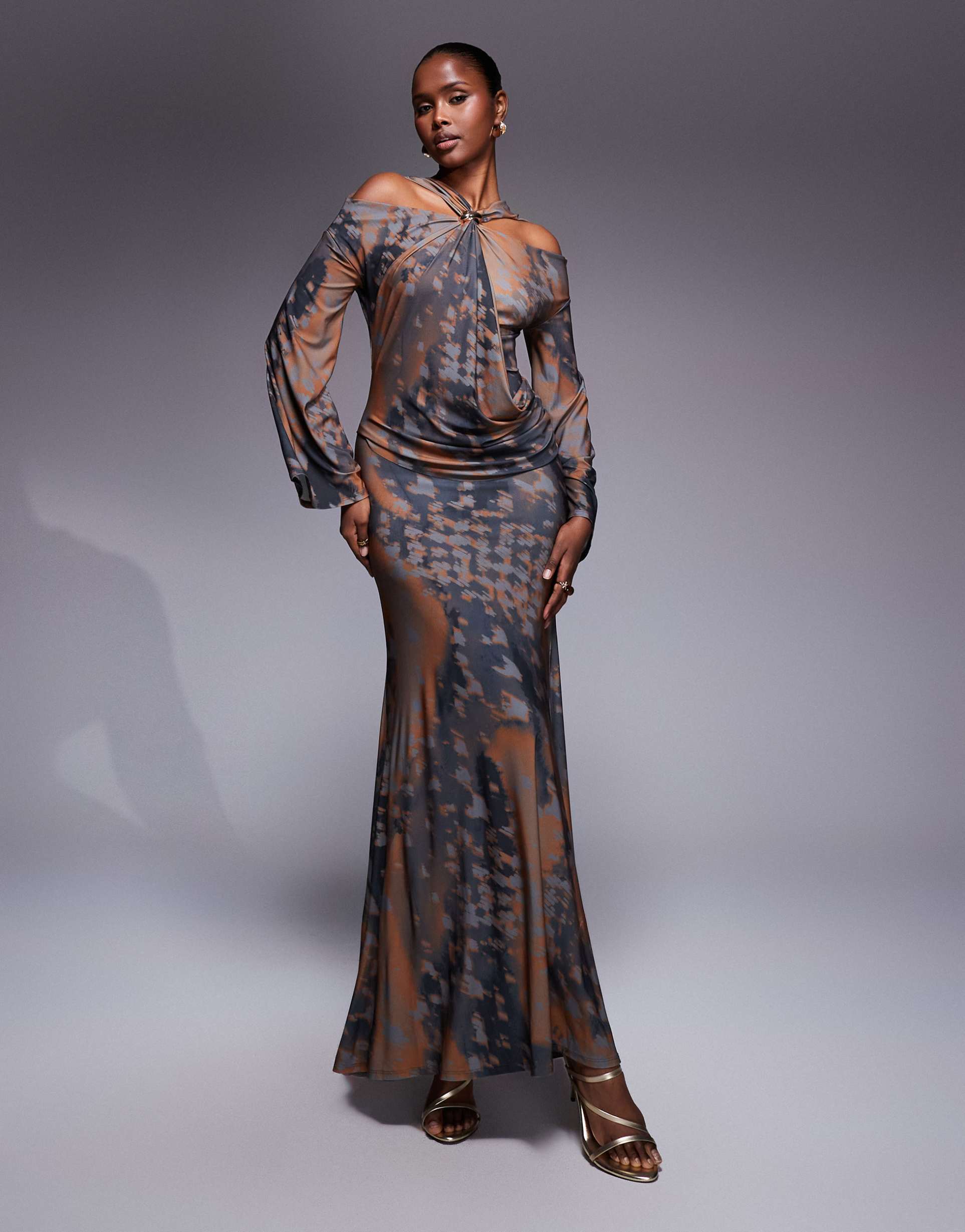 ASOS DESIGN PRINTED COLD SHOULDER MAXI DRESS WITH DRAPED FRONT AND TRIM IN ABSTRACT PRINT