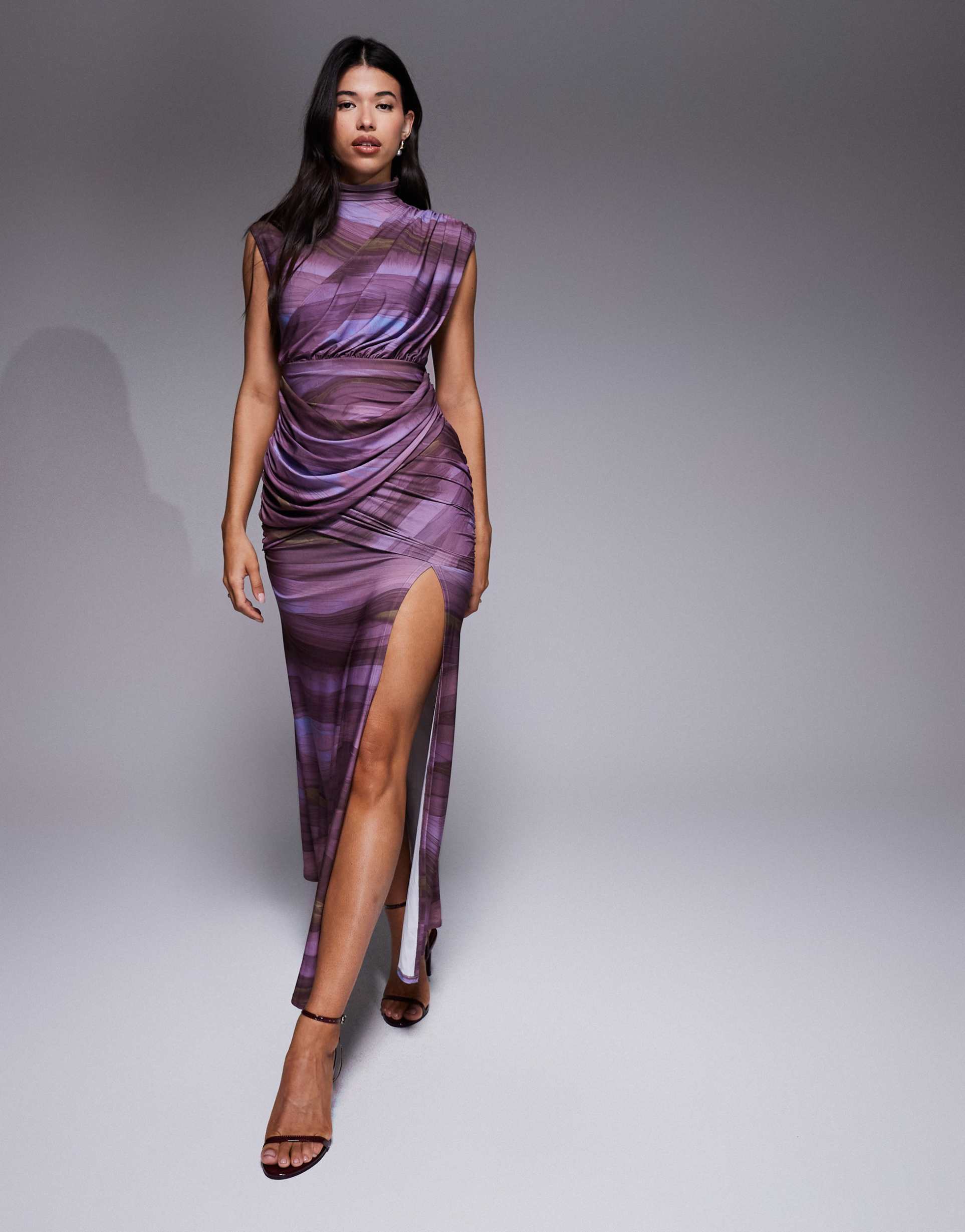 A slinky polyester fabric brings a smooth, clingy feel to this elegant and modern sheath silhouette maxi dress. Featuring a high neck and cap sleeves, the dress is designed with draped and ruched details along the front and bodice that enhance its slim fit. The striking all-over marbled abstract print in shades of purple and dusty rose adds visual intrigue, while the thigh-high slit and wrap-over waist detail introduce a subtle sexy edge. Ideal for date nights, cocktail parties, or nights out, this versatile piece suits all seasons.