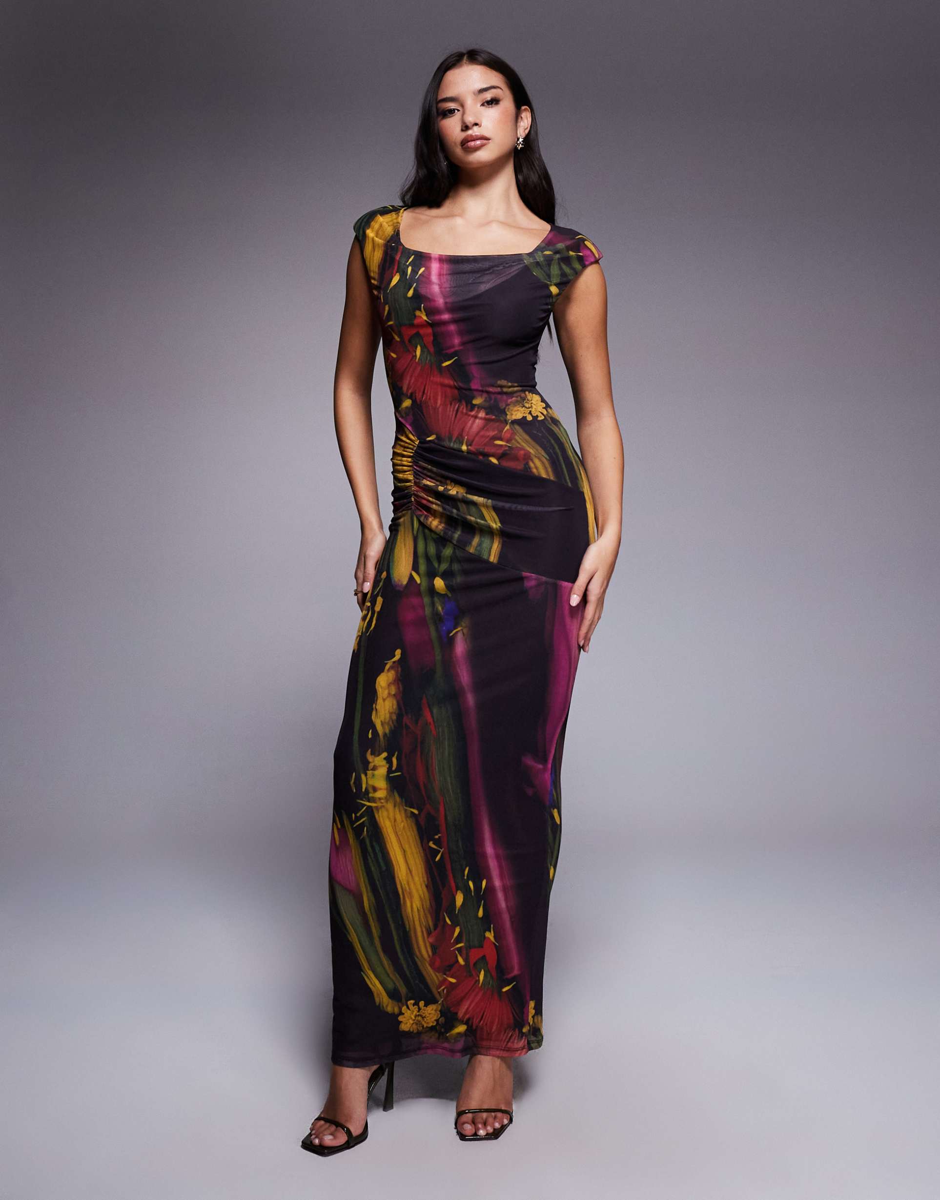 ASOS DESIGN PRINTED MESH COWL DRAPE MIDI DRESS WITH SHOULDER PAD IN DARK BLURRED FLORAL