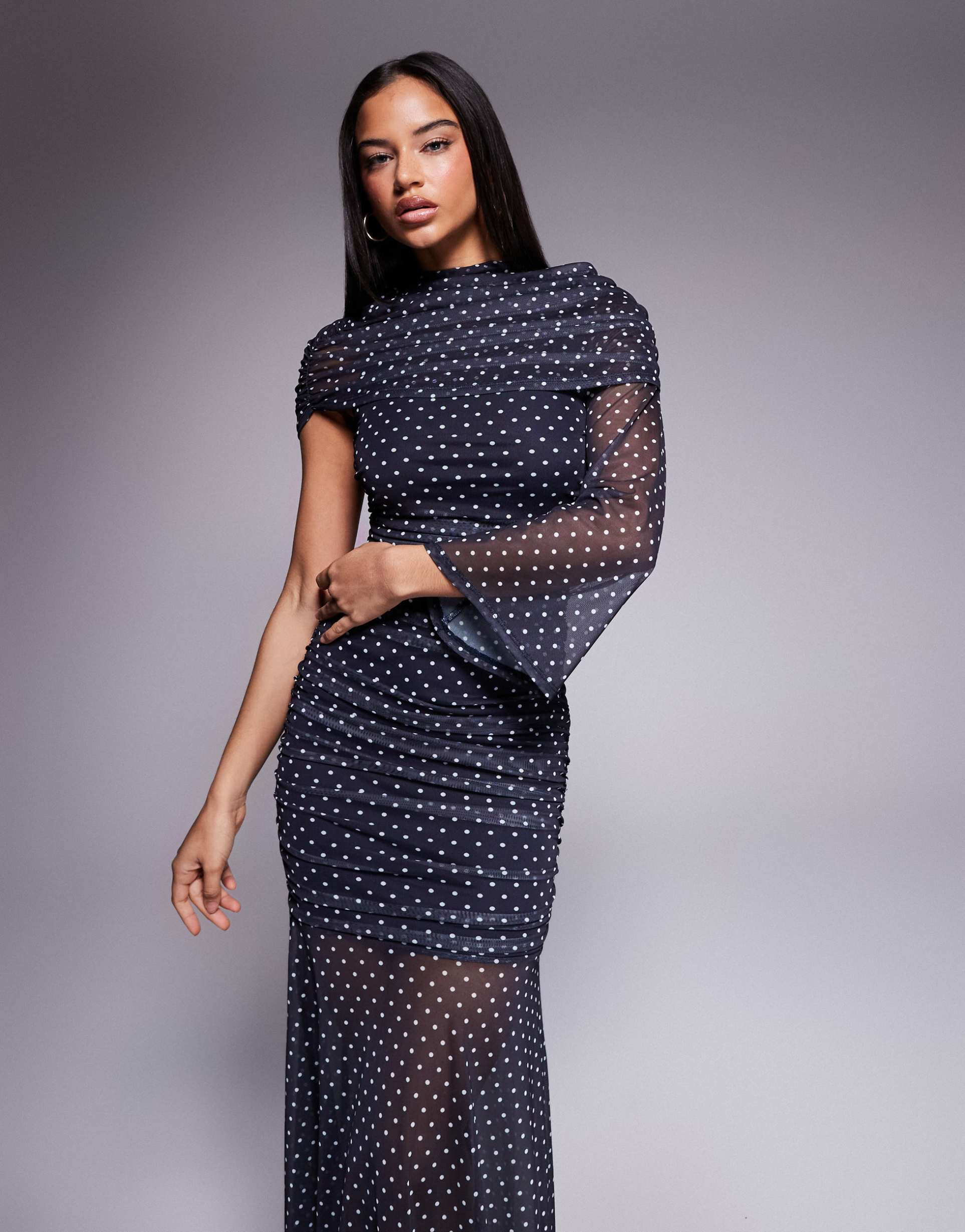 ASOS DESIGN PRINTED MESH DRAPED SHOULDER ASYMMETRICAL CAPE MAXI DRESS IN NAVY SPOT