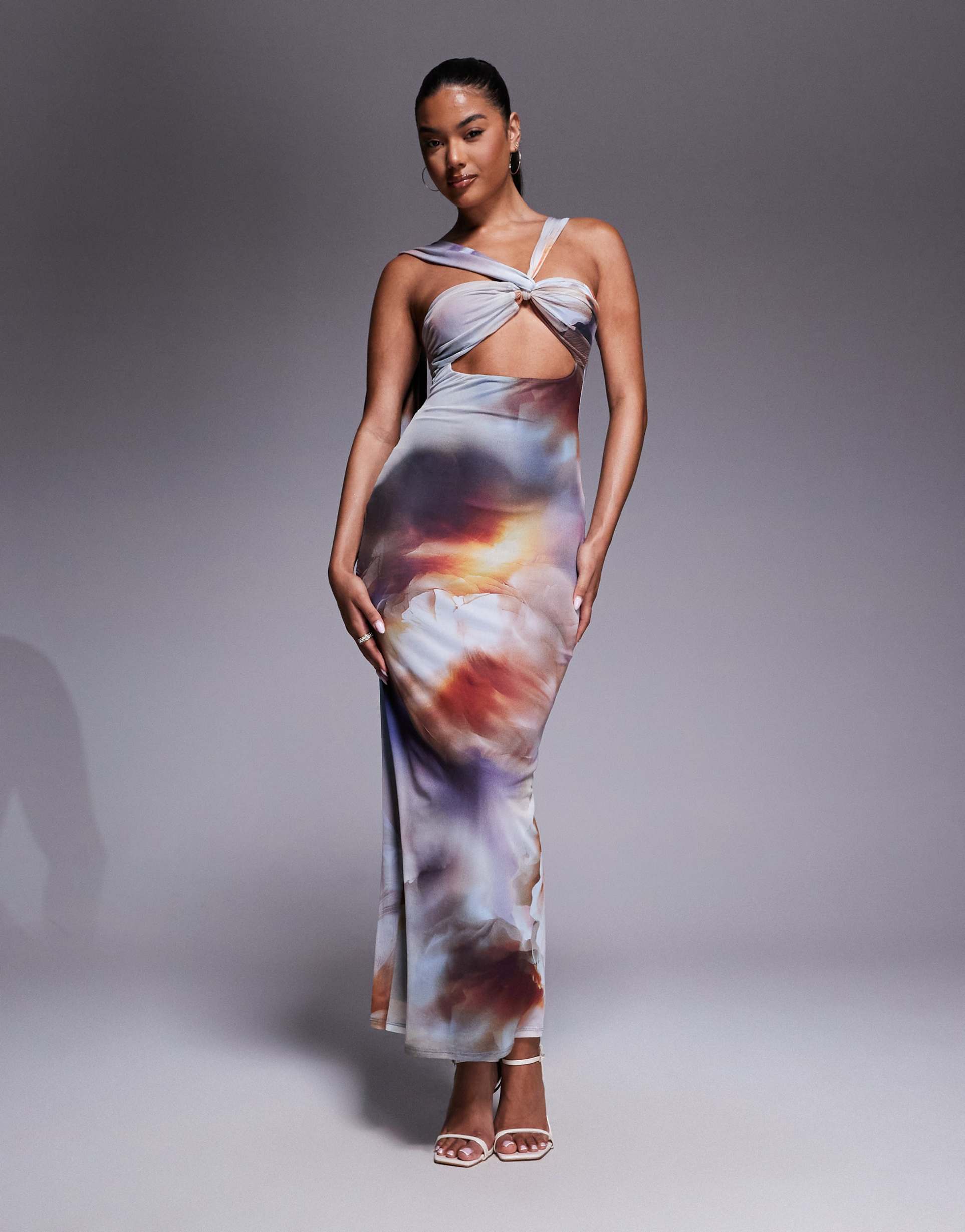 ASOS DESIGN PRINTED MESH HALTERNECK MAXI DRESS IN ABSTRACT PRINT