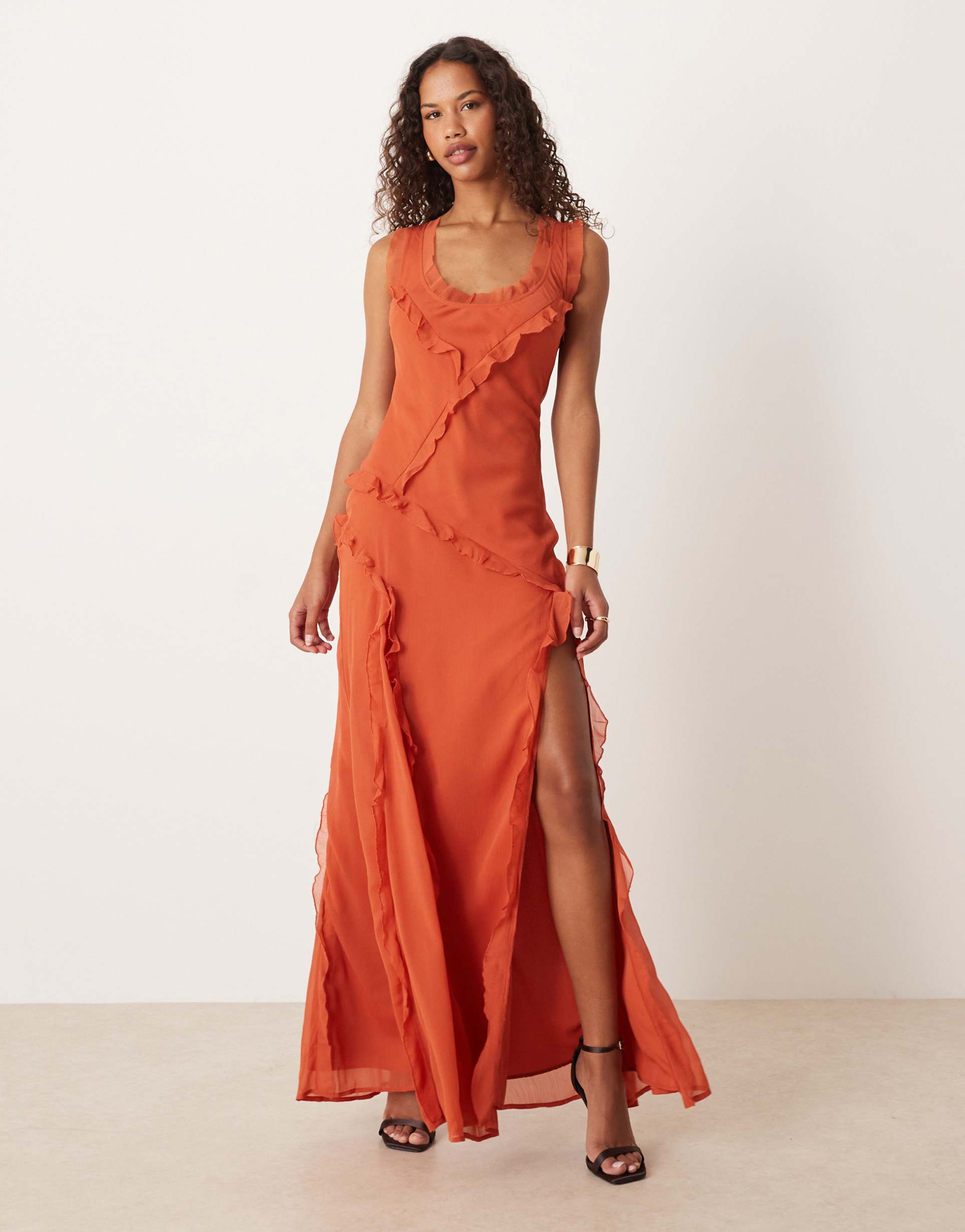 Soft matte rust polyester woven fabric and a flowing maxi hem with raw edges create an effortlessly elegant silhouette. The regular fit A-Line cut features a flattering scoop neckline and sleeveless styling, enhanced by ruffle details cascading along the front and hem. A daring side slit and low open back add a touch of modern allure. Ideal for spring, summer, and autumn occasions, this dress suits brunches, date nights, and cocktail events with ease.