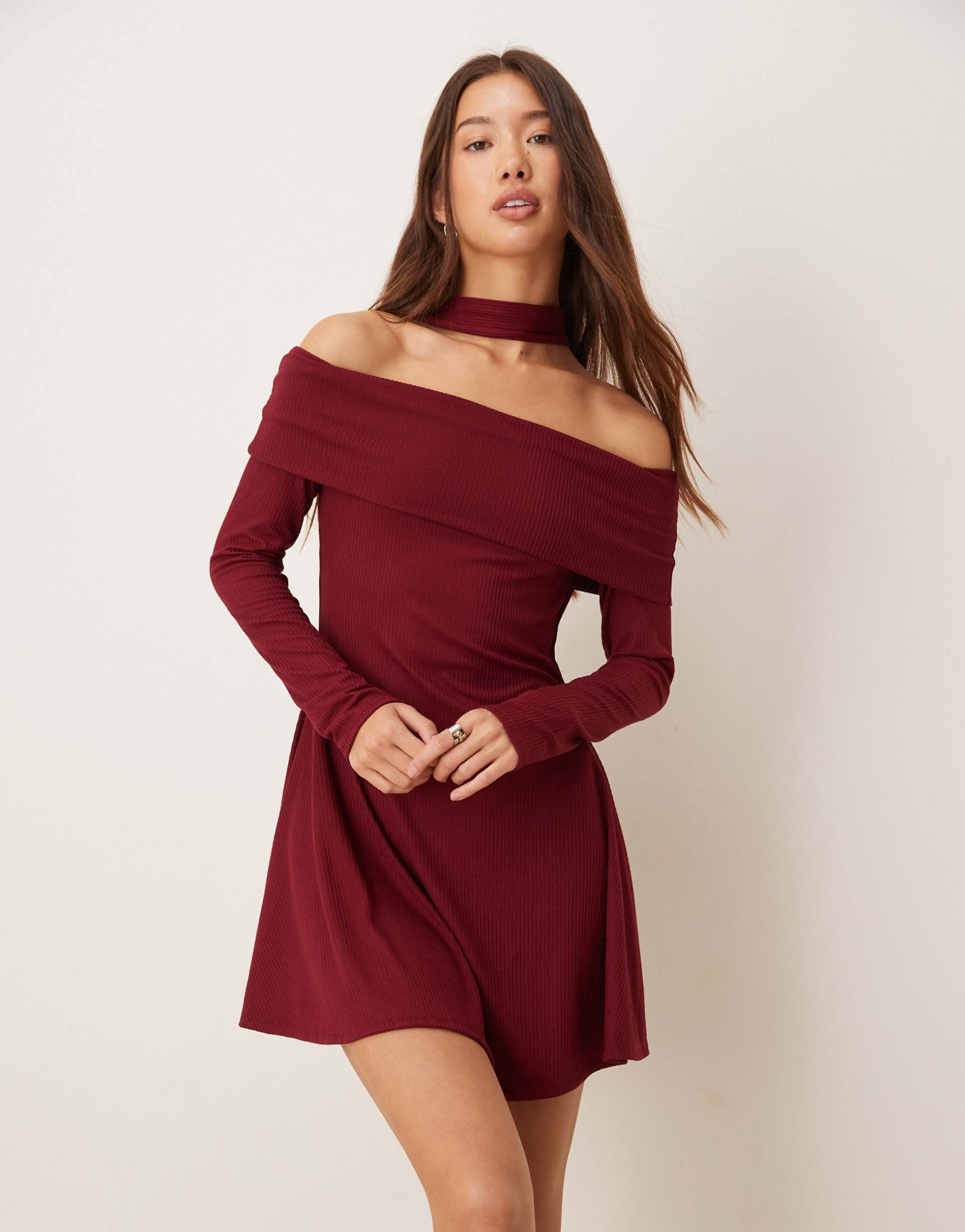 ASOS DESIGN RIBBED BARDOT MINI DRESS WITH SCARF DETAIL IN BURGUNDY