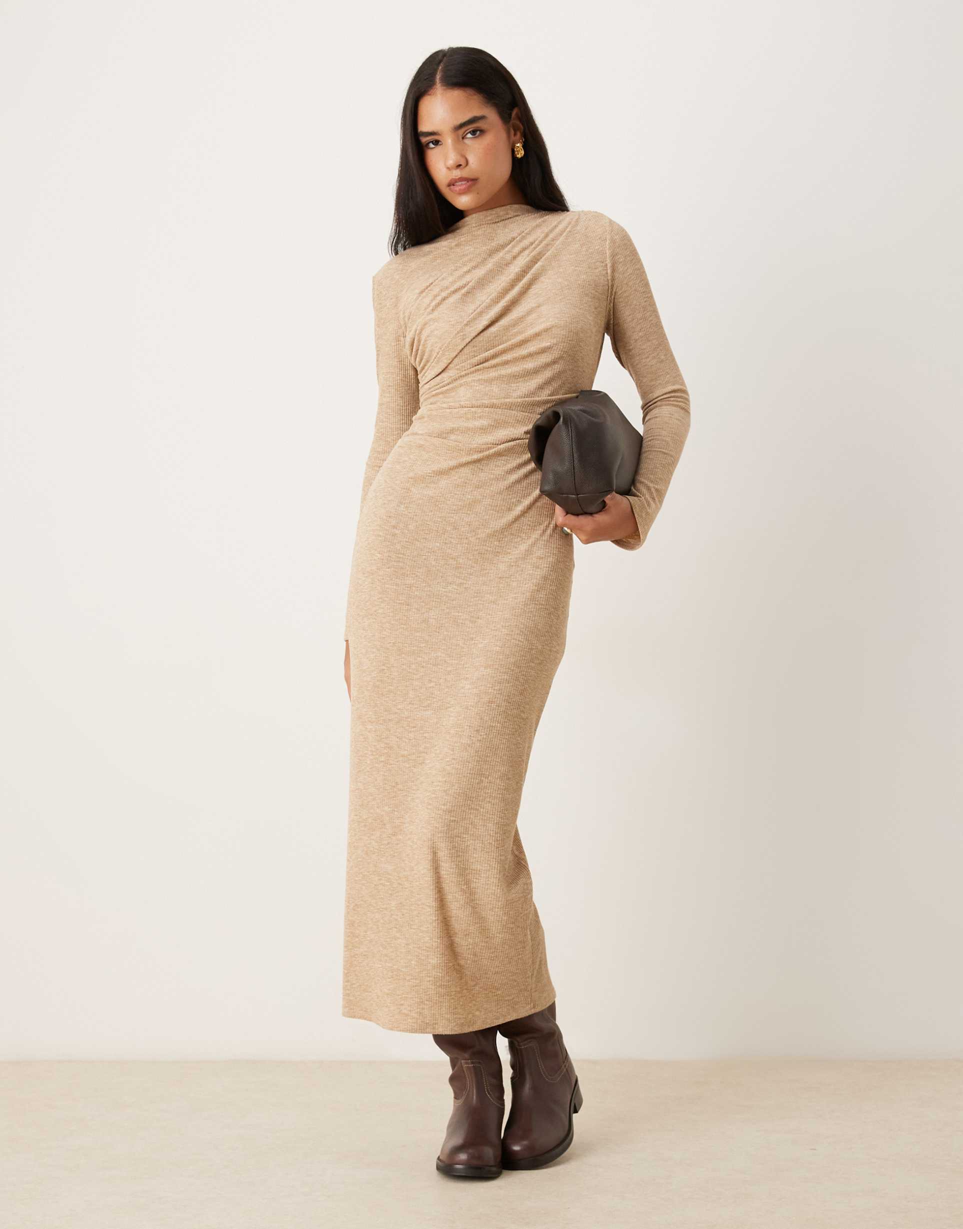 ASOS DESIGN RIBBED DRAPE MAXI DRESS IN NEUTRAL HEATHER