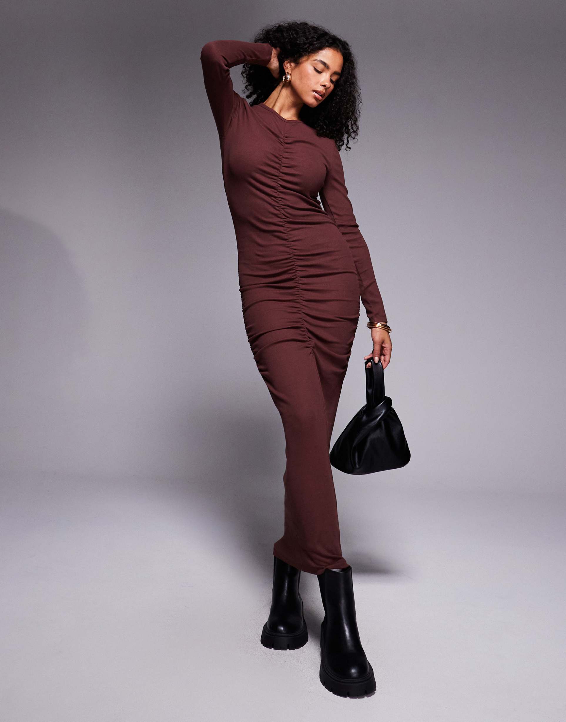 ASOS DESIGN RIBBED RUCHED MIDI DRESS IN CHOCOLATE