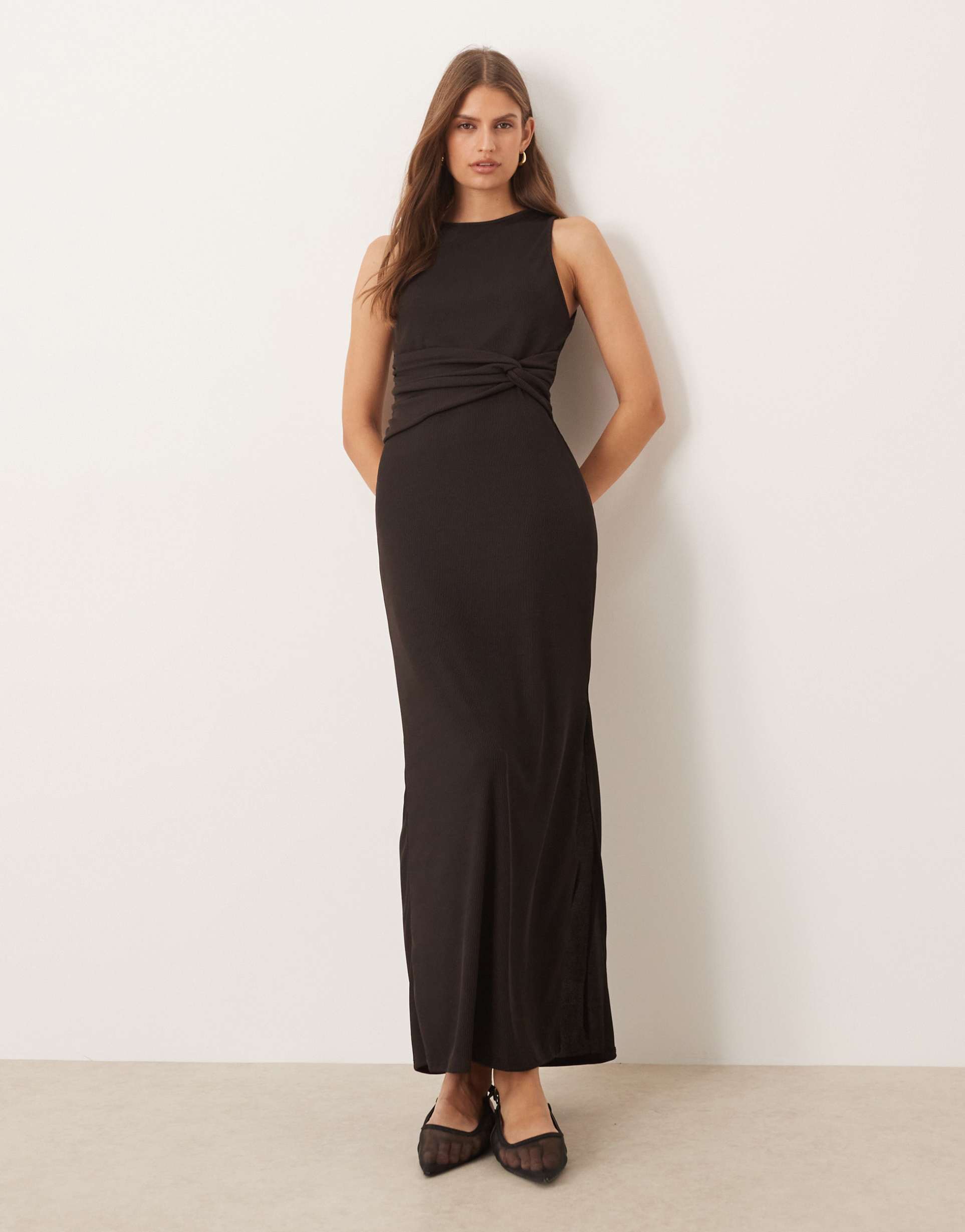 ASOS DESIGN RIBBED SLEEVELESS RACER KNOT WAIST MIDI DRESS IN CHOCOLATE