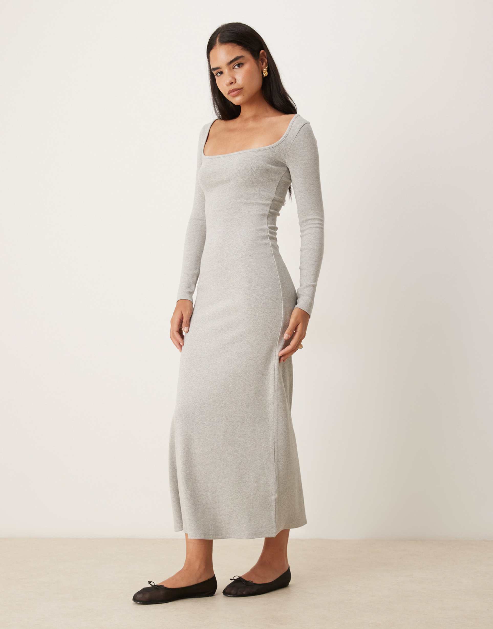 ASOS DESIGN RIBBED SQUARE NECK MAXI DRESS IN GRAY