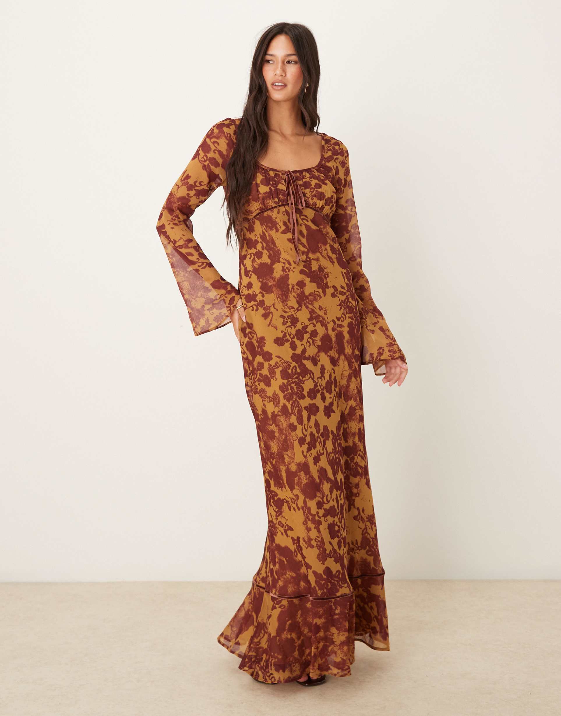 Soft chiffon fabric with delicate velvet trims and an abstract orange and brown pattern create a striking column silhouette maxi dress. The regular fit skims the body gracefully, featuring a flattering scoop neckline and long flared sleeves with ruffled cuffs. A ruched bust and tie detail add romantic charm, while the ruffled hem enhances movement. Ideal for autumn and winter, this elegant and trendy dress suits cocktail parties, date nights, and evening events with ease and sophistication.