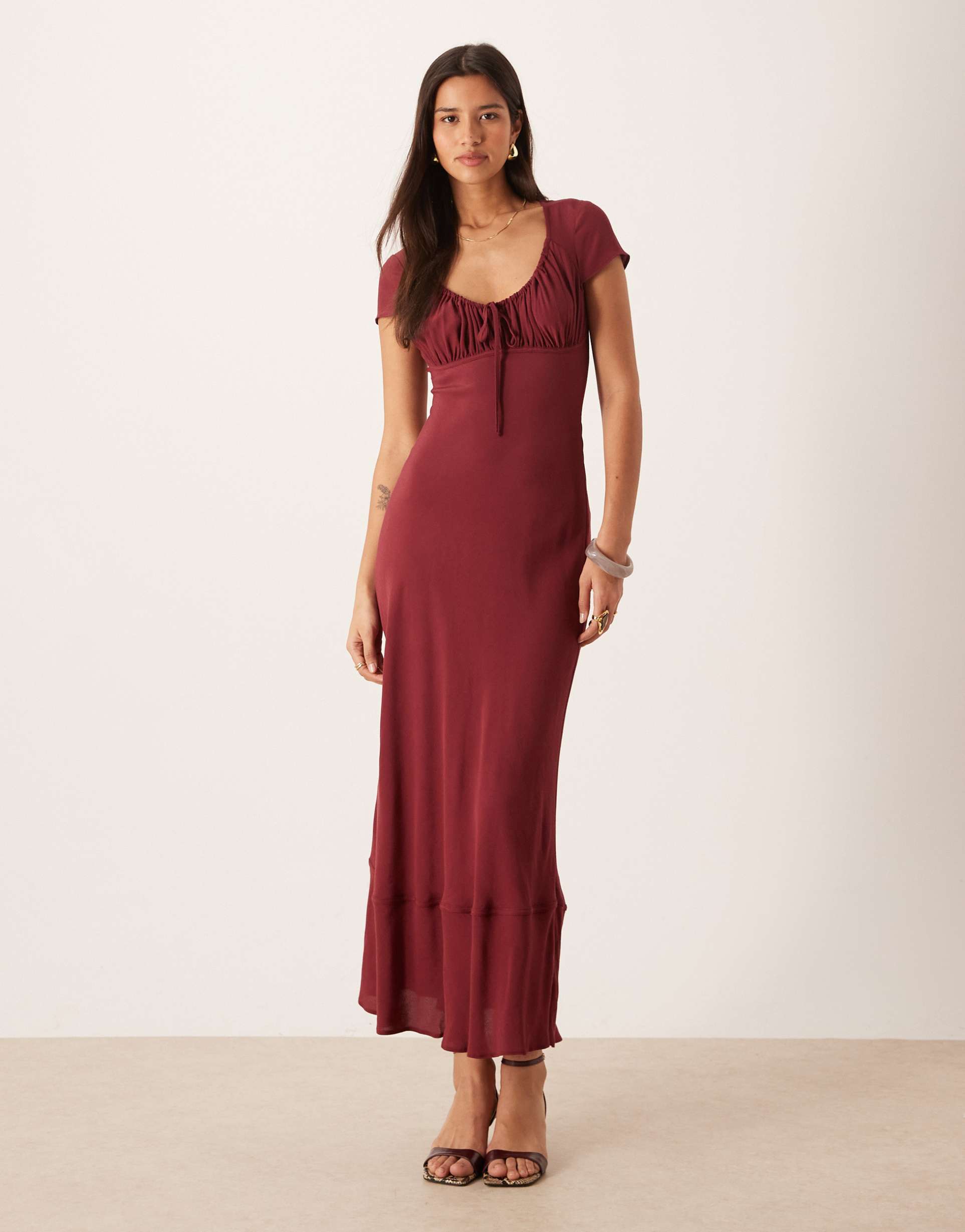 ASOS DESIGN RUCHED FRONT PUFF SLEEVE MAXI DRESS IN BURGUNDY