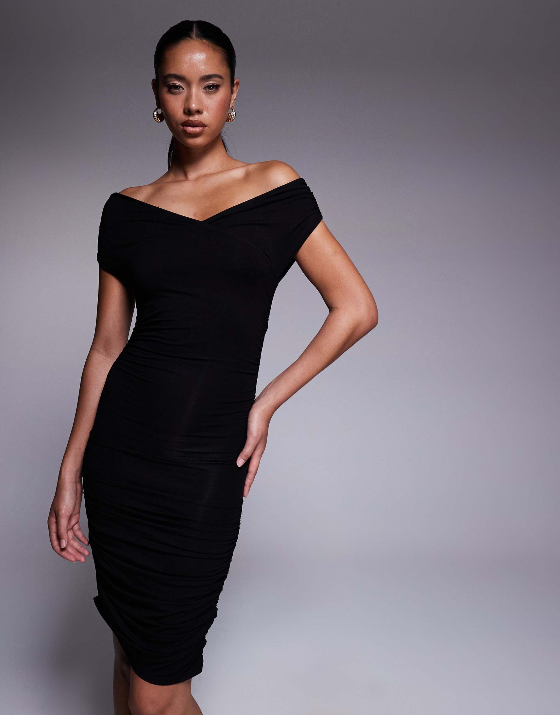 ASOS DESIGN RUCHED OFF-THE-SHOULDER MINI DRESS IN BLACK