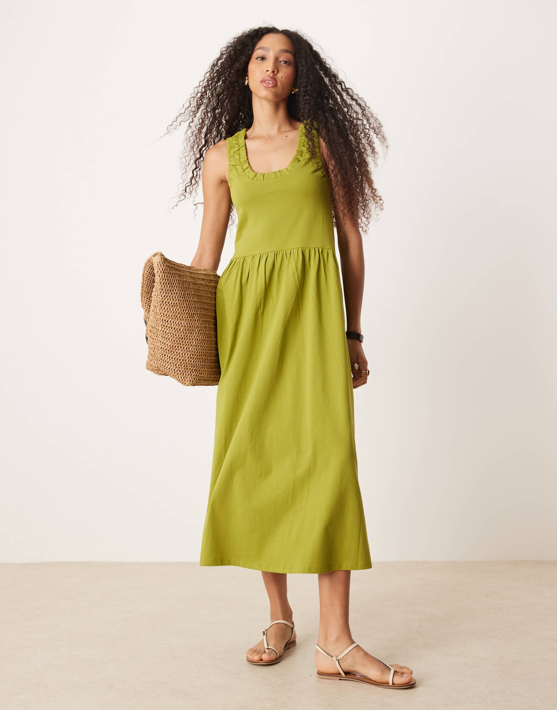 Soft, stretchy cotton jersey and a ruched smocked bodice create a comfortable yet stylish midi dress in a fresh olive hue. The regular fit and scoop neckline complement the sleeveless silhouette, while the racerback adds a sporty touch. Falling to a clean hemline, this versatile dress is ideal for casual days, brunches, or everyday wear during spring and summer. Its relaxed design and breathable fabric make it a perfect go-to for effortless style and comfort.