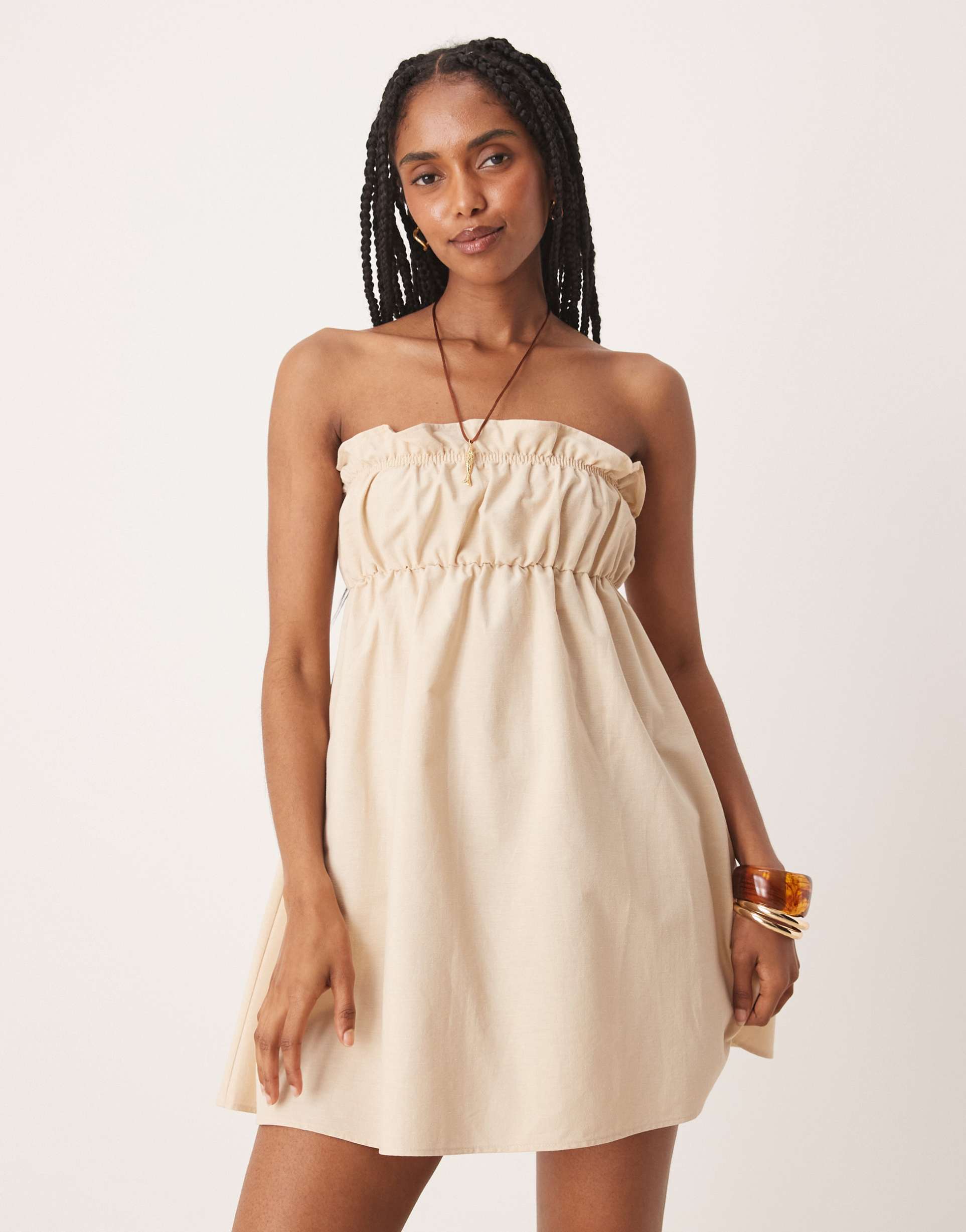 Soft cotton-linen blend fabric with a breathable texture shapes this strapless babydoll mini dress in a muted taupe hue. The ruched bust with ruffle detailing creates a charming focal point, complemented by a clean hemline and regular fit that skims comfortably. Ideal for casual days, brunch outings, or vacation wear, this minimalist design offers effortless style in warm seasons. Its bandeau neckline and sleeveless silhouette keep the look fresh and summery, while the lightweight fabric ensures comfort and ease throughout your day.