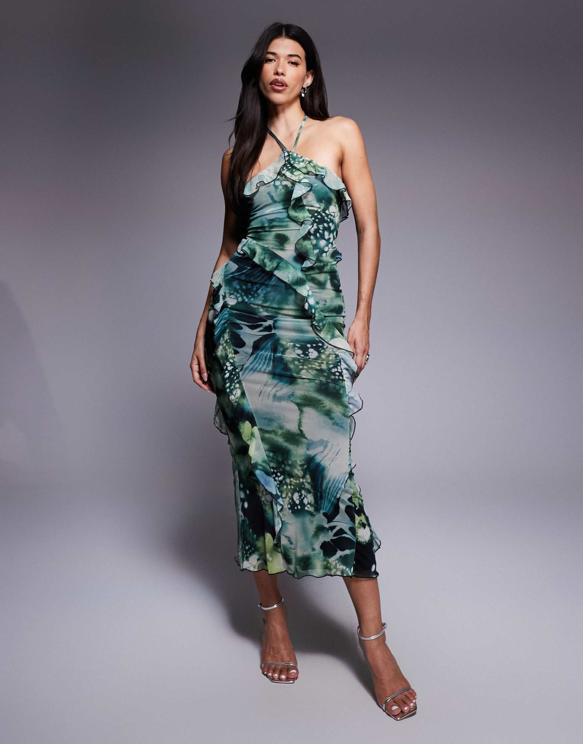 ASOS DESIGN RUFFLE WATERFALL HALTER MESH MIDI DRESS IN PRINT