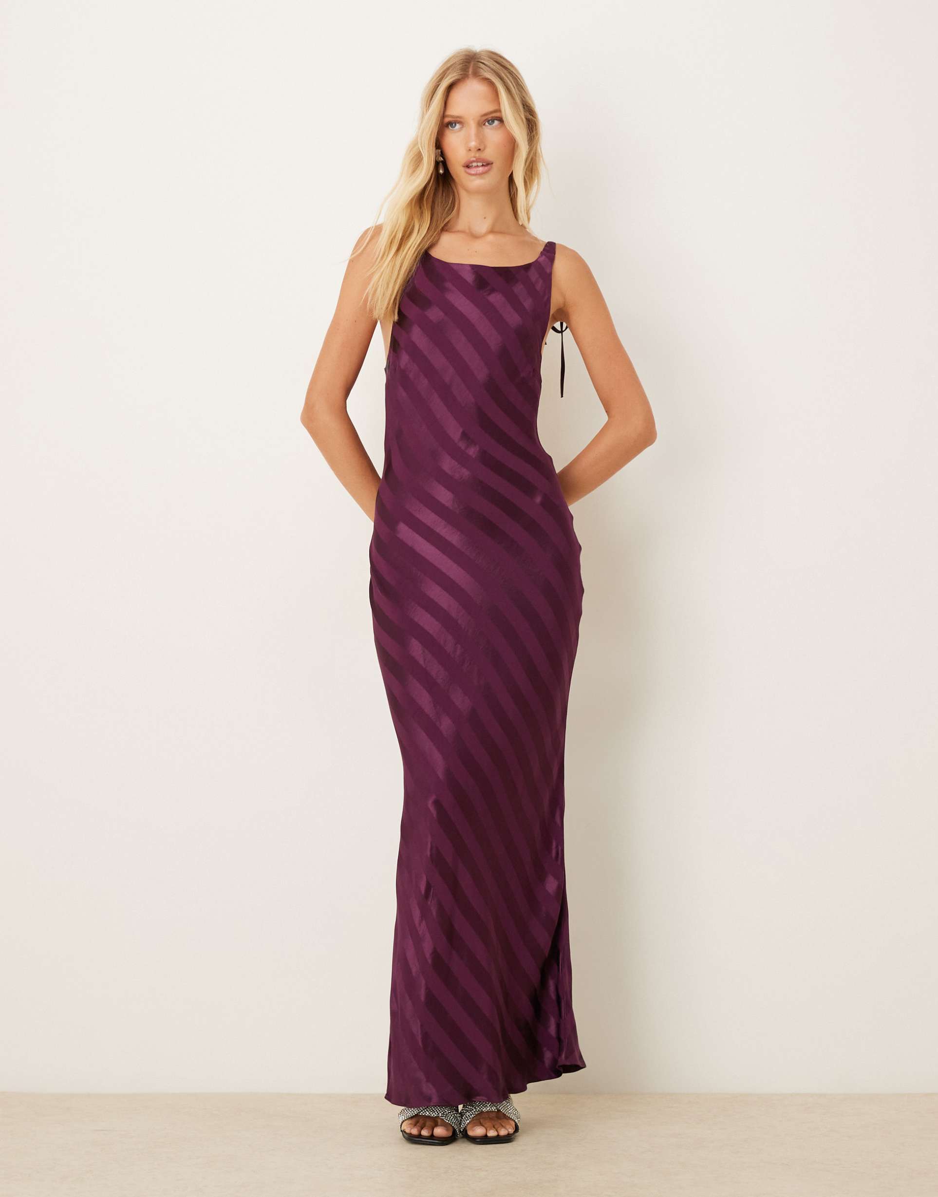 Glossy satin fabric and a figure-flattering slip silhouette define this plum maxi dress, featuring a scoop neckline and slender tie straps that reveal an elegant open back. The all-over striped pattern adds subtle texture and depth to the smooth finish, while the sleeveless cut and clean hemline enhance its sophisticated appeal. Ideal for cocktail parties, formal events, or romantic date nights, this regular fit dress combines classic style with modern elegance for versatile wear across seasons.