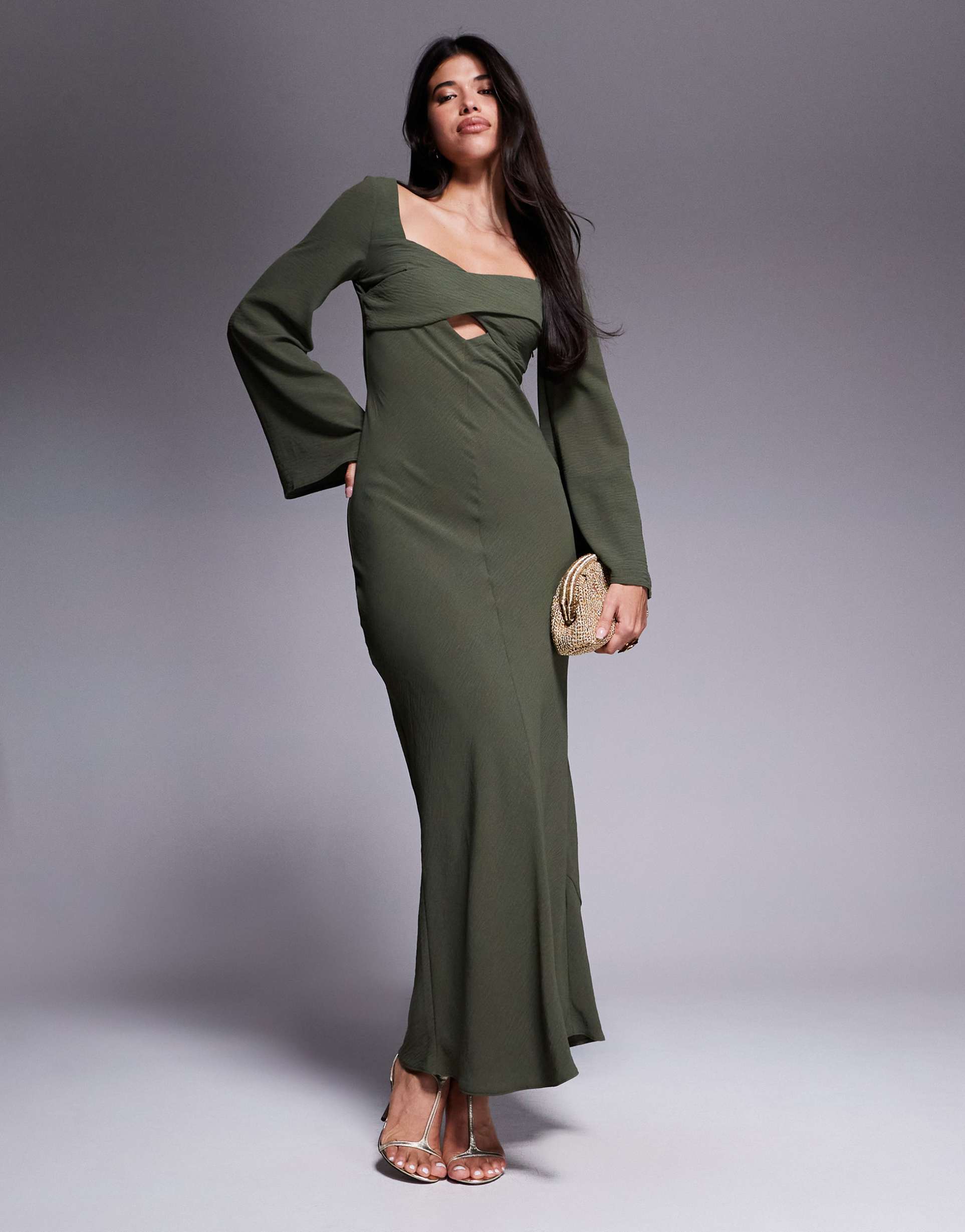 A matte dark khaki column silhouette with a regular fit creates a sleek and modern look, enhanced by a sweetheart neckline and long flared sleeves. The midi length and cut-out detail at the bust add an elegant twist, while the satin polyester blend fabric offers a subtle textured finish. This versatile dress is ideal for date nights, cocktail parties, and evening outings, combining sophistication with contemporary style for a confident, polished appearance.