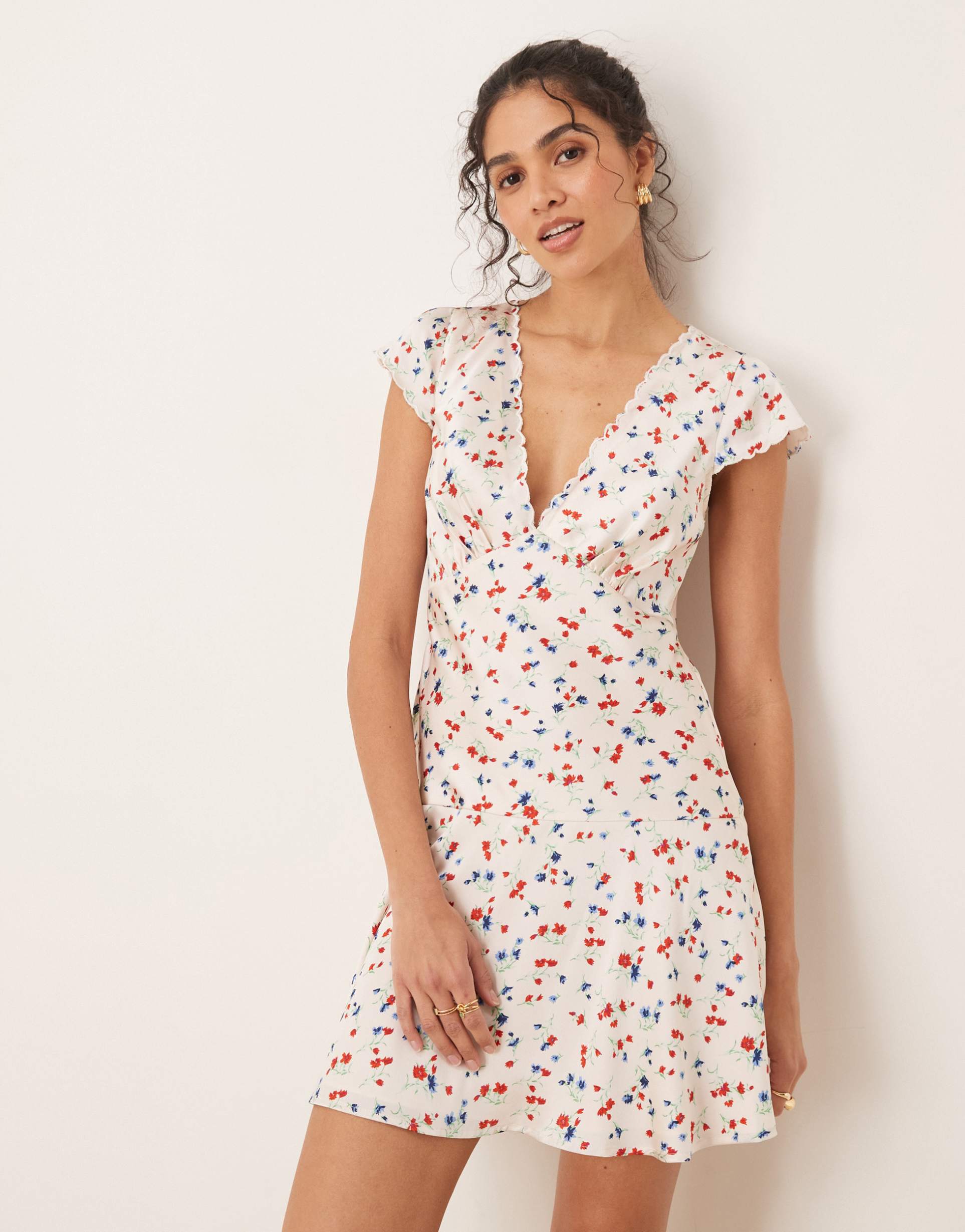 Soft satin fabric and a flirty A-line silhouette create a flippy mini dress designed for warm days. The off-white base is adorned with a delicate ditsy floral print in blue, red, green, and orange hues, enhancing its romantic charm. Featuring a deep plunge neckline and short sleeves with scalloped trim at the hem, this regular fit dress offers effortless style. Ideal for casual outings, brunch dates, or romantic evenings, it blends classic elegance with playful details to elevate your seasonal wardrobe.