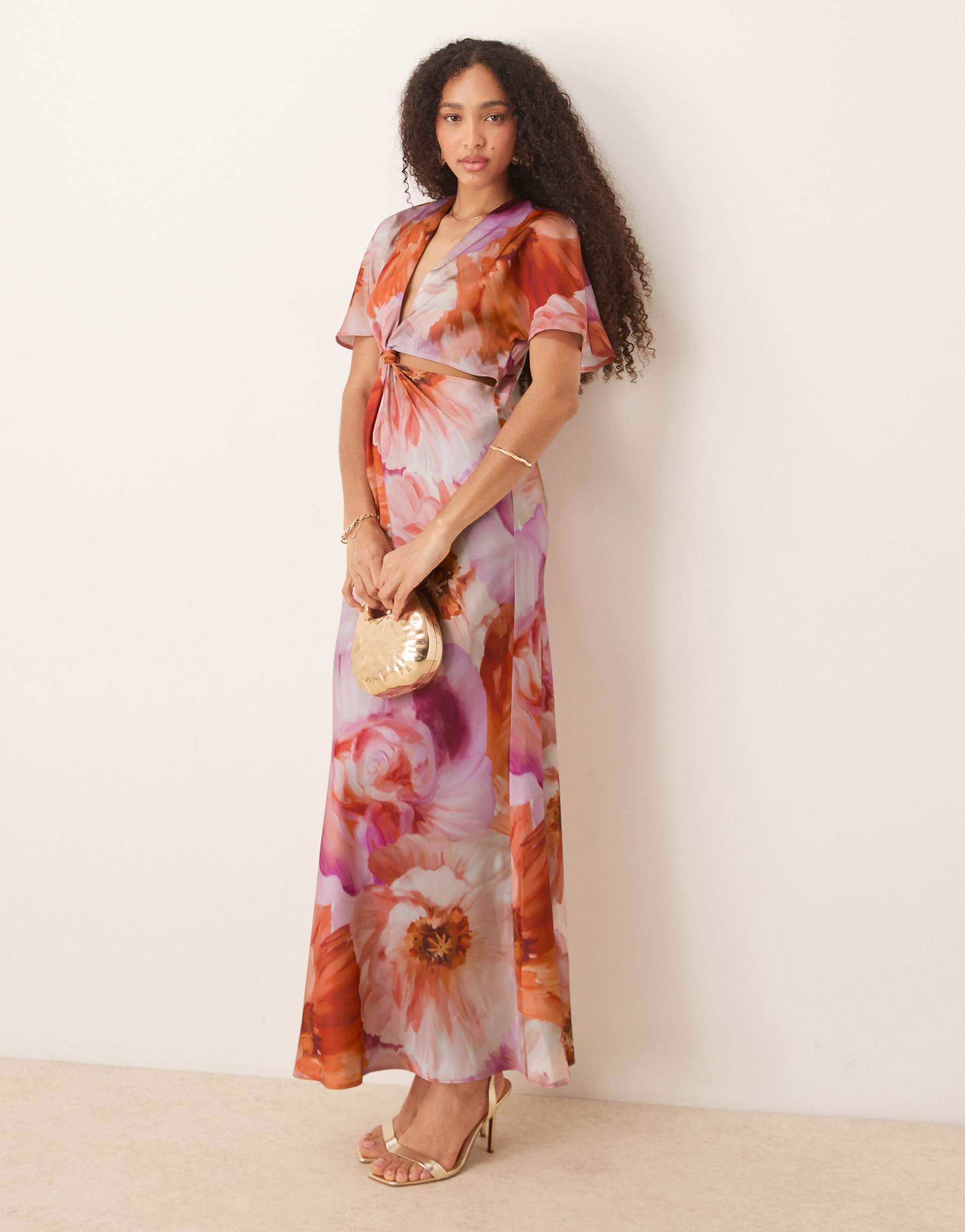 ASOS DESIGN SATIN KNOT DETAIL CUTOUT MIDI DRESS IN PINK ORANGE FLORAL