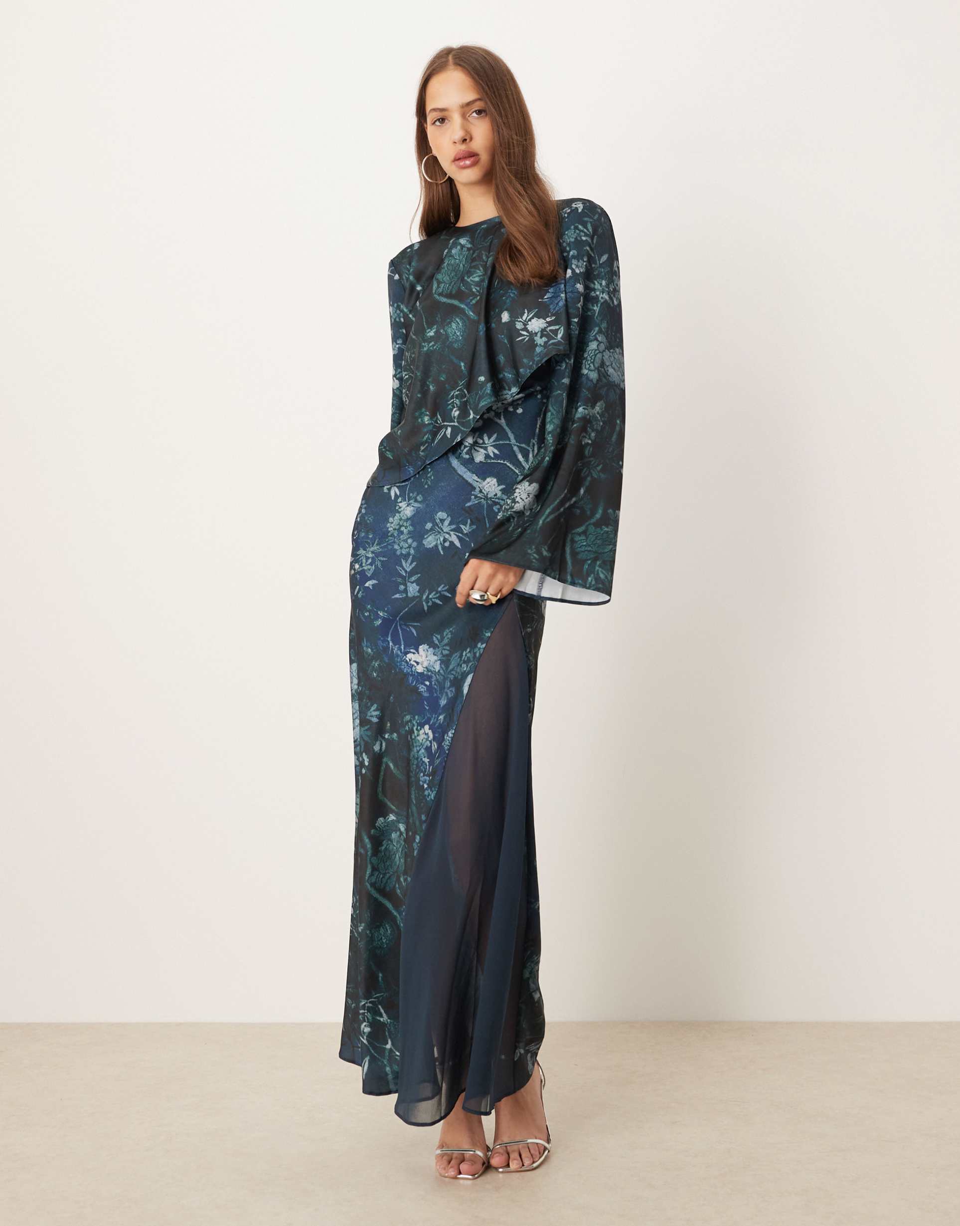 ASOS DESIGN SATIN LONG SLEEVE CAPE DETAIL MAXI DRESS IN NAVY FLORAL PRINT