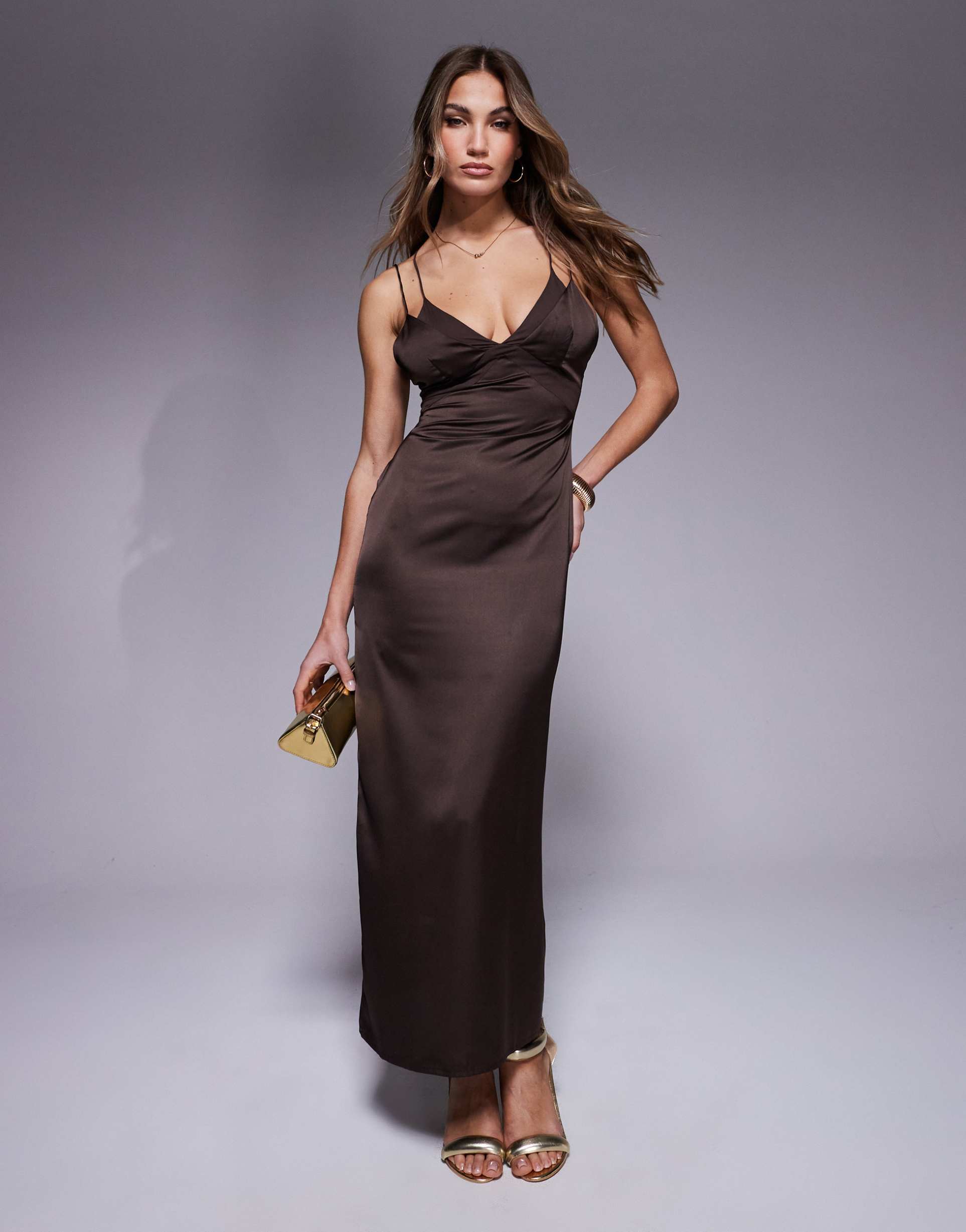 ASOS DESIGN SATIN MIDI DRESS WITH CHIFFON BUST DETAIL AND CROSS BACK IN CHOCOLATE BROWN
