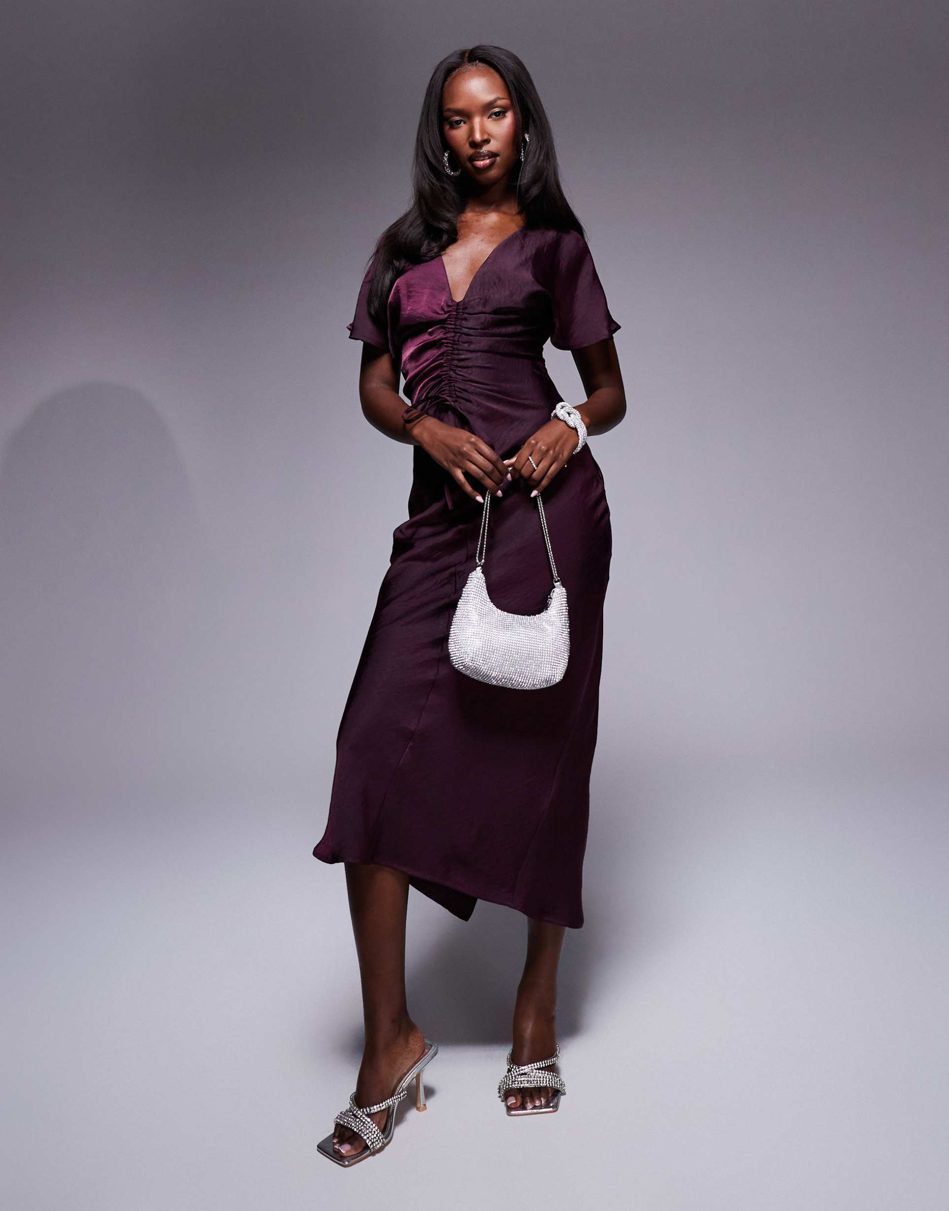 ASOS DESIGN SATIN RUCHED FRONT MIDI DRESS IN BERRY