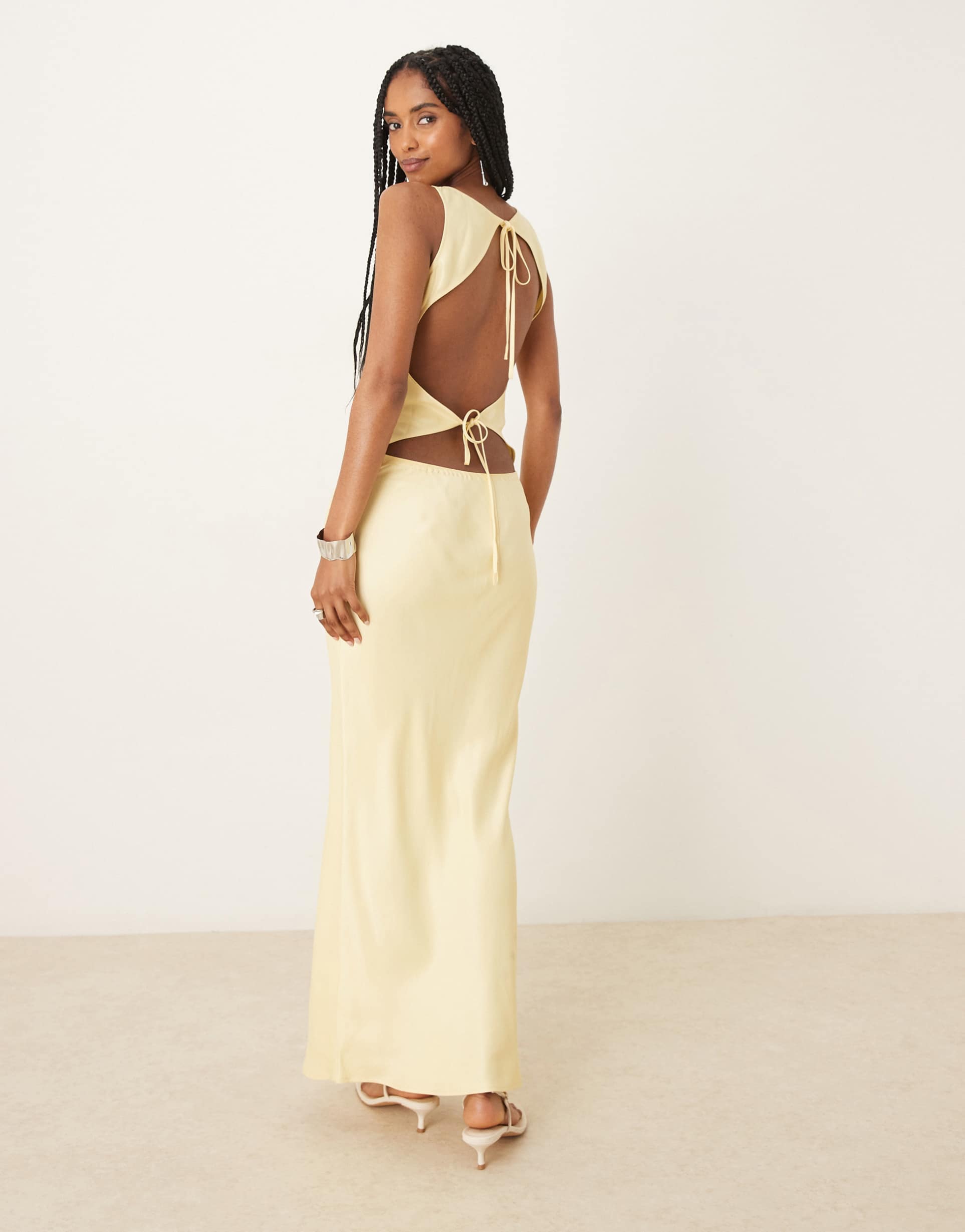 Glossy satin-style viscose fabric and a sleek sheath silhouette define this maxi dress, featuring a boat neckline and sleeveless cut for warm-weather elegance. The standout tie-back detail and cut-out back add an alluring touch, while the slim fit flatters the figure. Ideal for spring and summer occasions, this buttercup-hued dress suits brunches, date nights, and cocktail parties with its minimalist yet sophisticated charm.