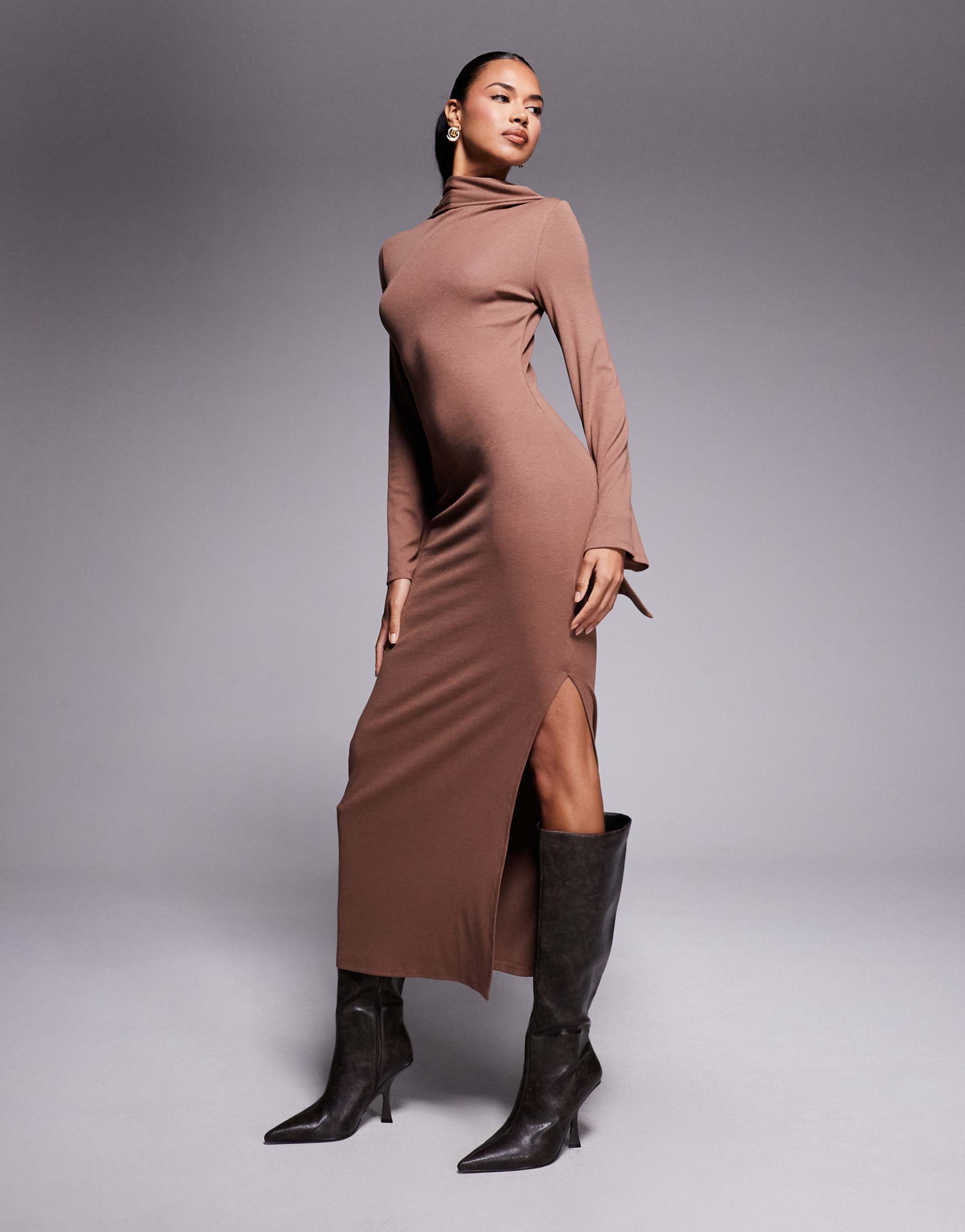 ASOS DESIGN SCARF DETAIL FLUTED SLEEVE MIDI DRESS IN BROWN