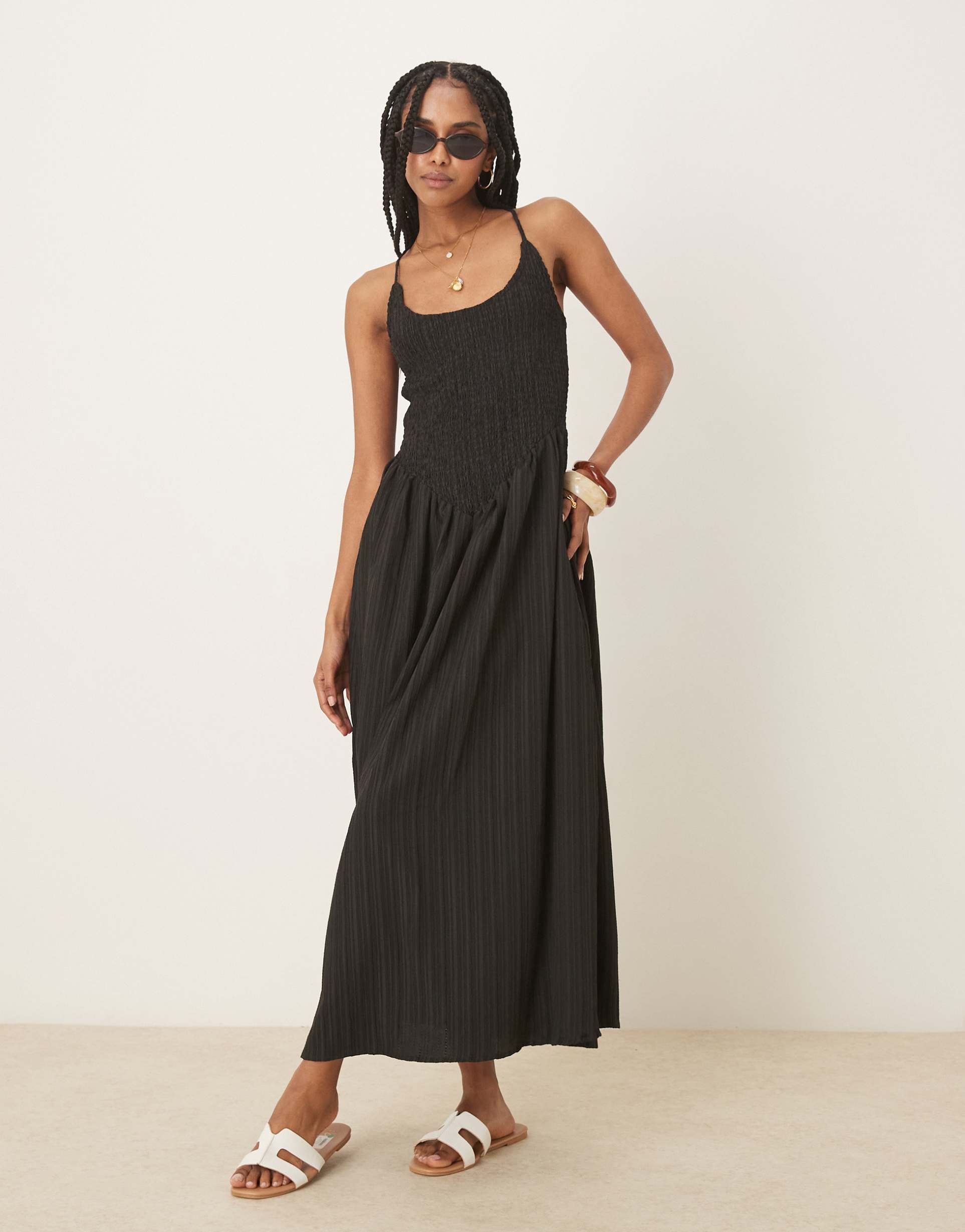Effortless style meets comfort in this matte black maxi dress featuring a relaxed shift silhouette and a flattering scoop neckline. The sleeveless design with delicate spaghetti straps crosses at the back, adding a subtle twist to the minimalist look. Crafted from plain-woven polyester with a crinkle texture, it includes a shirred, stretch bodice for a comfortable, regular fit and a drop waist that enhances the flowy hemline. Ideal for casual outings, brunches, or date nights, this dress embodies casual chic sophistication for spring and summer wardrobes.