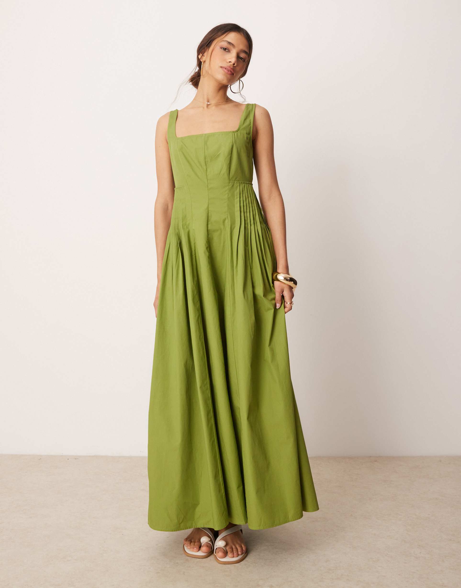 Soft matte olive cotton defines this maxi dress with a flattering A-line silhouette and a square neckline framed by fixed wide straps. The pleated waist adds subtle shaping, complemented by a shirred stretch panel at the back for comfort and fit. Sleeveless and flowing to the floor with a clean hem, this regular fit dress is perfect for spring and summer days. Ideal for casual outings, brunch dates, or relaxed evenings, it blends classic style with casual chic ease, offering breathable cotton comfort and timeless appeal.