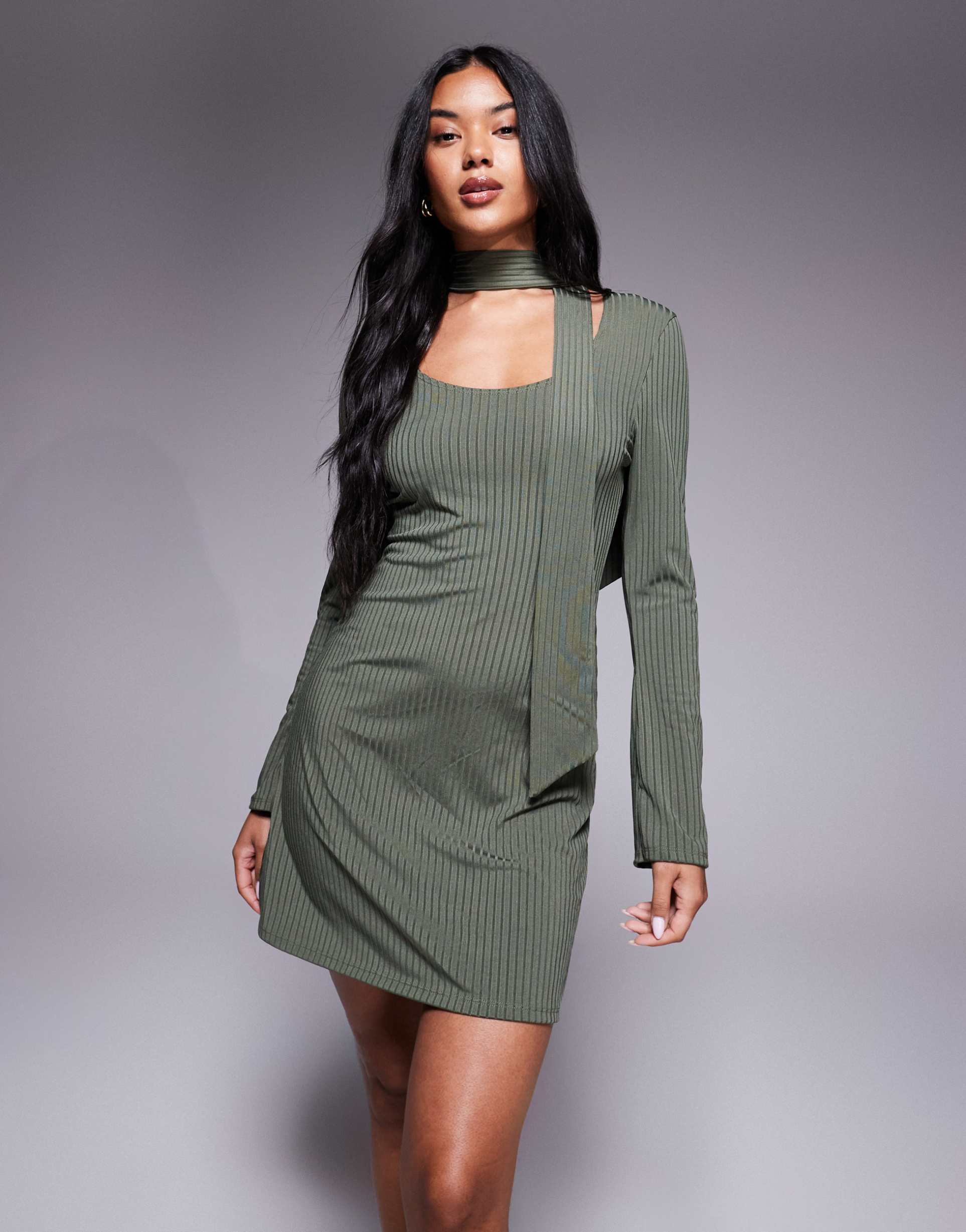 ASOS DESIGN SCOOP NECK SCARF MINI DRESS IN KHAKI