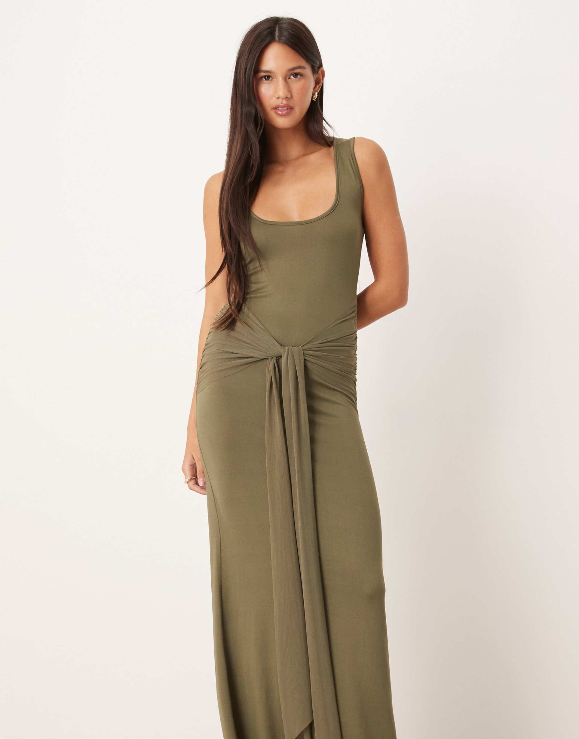 ASOS DESIGN SCOOP TIE FRONT MAXI DRESS IN KHAKI
