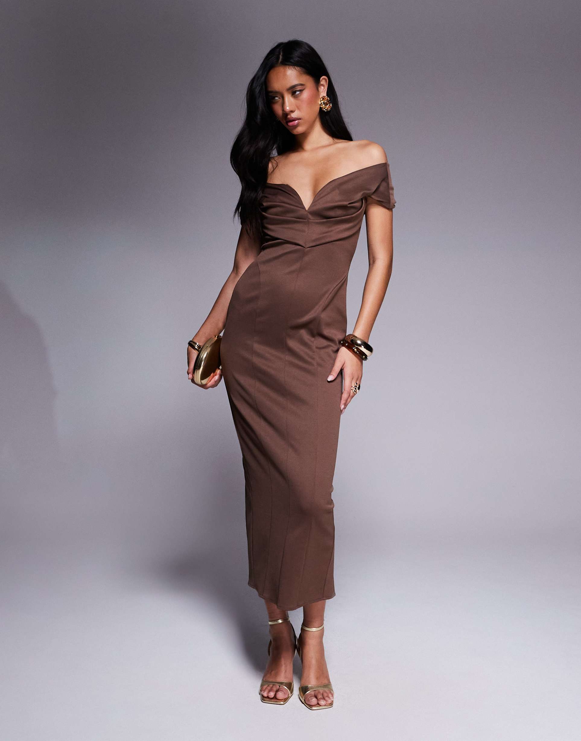 ASOS DESIGN SCULPTED BARDOT MIDI PENCIL DRESS WITH SEAM DETAILING IN CHOCOLATE